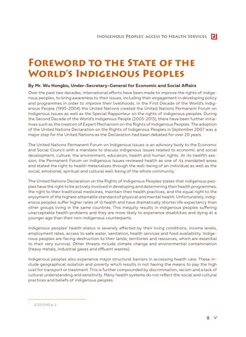 Foreword to the State of the World’s Indigenous Peoples By Mr. Wu Hongbo, Under-Secretary-General for Economic and Social Affairs Over the past two decades, international efforts have been made to improve the rights of indigenous peoples, to bring awareness to their issues, including their engagement in developing policy and programmes in order to improve their livelihoods. In the First Decade of the World’s Indigenous People (1995-2004) the United Nations created the United Nations Permanent Forum on Indigenous Issues as well as the Special Rapporteur on the rights of indigenous peoples. During the Second Decade of the World’s Indigenous People (2005-2015), there have been further initiatives such as the creation of Expert Mechanism on the Rights of Indigenous Peoples. The adoption of the United Nations Declaration on the Rights of Indigenous Peoples in September 2007 was a major step for the United Nations as the Declaration had been debated for over 20 years. The United Nations Permanent Forum on Indigenous Issues is an advisory body to the Economic and Social Council with a mandate to discuss indigenous issues related to economic and social development, culture, the environment, education, health and human rights. At its twelfth session, the Permanent Forum on Indigenous Issues reviewed health as one of its mandated areas and stated the right to health materializes through the well-being of an individual as well as the social, emotional, spiritual and cultural well-being of the whole community.1 The United Nations Declaration on the Rights of Indigenous Peoples states that indigenous peoples have the right to be actively involved in developing and determining their health programmes; the right to their traditional medicines, maintain their health practices, and the equal right to the enjoyment of the highest attainable standard of physical and mental health. Unfortunately, indigenous peoples suffer higher rates of ill health and have dramatically shorter life expectancy than other groups living in the same countries. This inequity results in indigenous peoples suffering unacceptable health problems and they are more likely to experience disabilities and dying at a younger age than their non-indigenous counterparts. Indigenous peoples’ health status is severely affected by their living conditions, income levels, employment rates, access to safe water, sanitation, health services and food availability. Indigenous peoples are facing destruction to their lands, territories and resources, which are essential to their very survival. Other threats include climate change and environmental contamination (heavy metals, industrial gases and effluent wastes). Indigenous peoples also experience major structural barriers in accessing health care. These include geographical isolation and poverty which results in not having the means to pay the high cost for transport or treatment. This is further compounded by discrimination, racism and a lack of cultural understanding and sensitivity. Many health systems do not reflect the social and cultural practices and beliefs of indigenous peoples.
