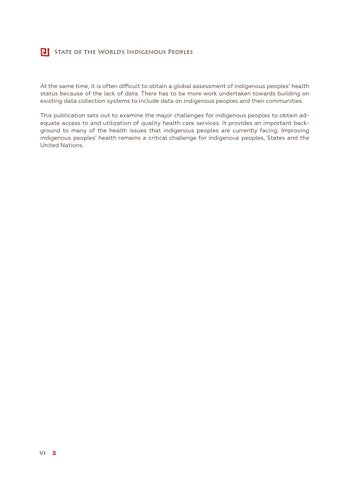 At the same time, it is often difficult to obtain a global assessment of indigenous peoples’ health status because of the lack of data. There has to be more work undertaken towards building on existing data collection systems to include data on indigenous peoples and their communities. This publication sets out to examine the major challenges for indigenous peoples to obtain adequate access to and utilization of quality health care services. It provides an important background to many of the health issues that indigenous peoples are currently facing. Improving indigenous peoples’ health remains a critical challenge for indigenous peoples, States and the United Nations.