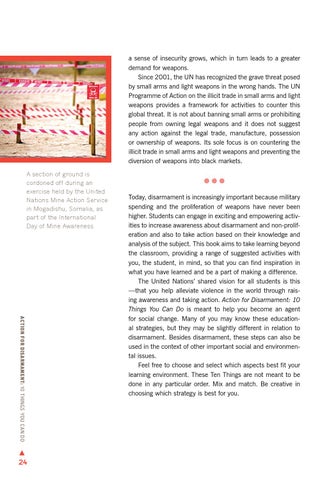 a sense of insecurity grows, which in turn leads to a greater demand for weapons. Since 2001, the UN has recognized the grave threat posed by small arms and light weapons in the wrong hands. The UN Programme of Action on the illicit trade in small arms and light weapons provides a framework for activities to counter this global threat. It is not about banning small arms or prohibiting people from owning legal weapons and it does not suggest any action against the legal trade, manufacture, possession or ownership of weapons. Its sole focus is on countering the illicit trade in small arms and light weapons and preventing the diversion of weapons into black markets. A section of ground is cordoned off during an exercise held by the United Nations Mine Action Service in Mogadishu, Somalia, as part of the International Day of Mine Awareness.