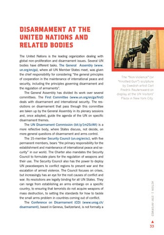 The United Nations is the leading organization dealing with global non-proliferation and disarmament issues. Several UN bodies have different tasks. The General Assembly (www. un.org/en/ga), where all UN Member States meet, was given the chief responsibility for considering “the general principles of cooperation in the maintenance of international peace and security, including the principles governing disarmament and the regulation of armaments”. The General Assembly has divided its work over several committees. The First Committee (www.un.org/en/ga/first) deals with disarmament and international security. The resolutions on disarmament that pass through this committee are taken up by the General Assembly in its plenary sessions and, once adopted, guide the agenda of the UN on specific disarmament themes. The UN Disarmament Commission (bit.ly/1m2ScWt) is a more reflective body, where States discuss, not decide, on more general questions of disarmament and arms control. The 15-member Security Council (un.org/en/sc), with five permanent members, bears “the primary responsibility for the establishment and maintenance of international peace and security” in our world. The Charter also mandates the Security Council to formulate plans for the regulation of weapons and their use. The Security Council also has the power to deploy UN peacekeepers to conflict regions to prevent war and the escalation of armed violence. The Council focuses on crises, but increasingly has an eye for the root causes of conflict and war. Its resolutions are legally binding for all UN States. They can range from establishing an arms embargo on a specific country, to ensuring that terrorists do not acquire weapons of mass destruction, to setting the standards for how to tackle the small arms problem in countries coming out of conflict. The Conference on Disarmament (CD) (www.unog.ch/ disarmament), based in Geneva, Switzerland, is not formally a