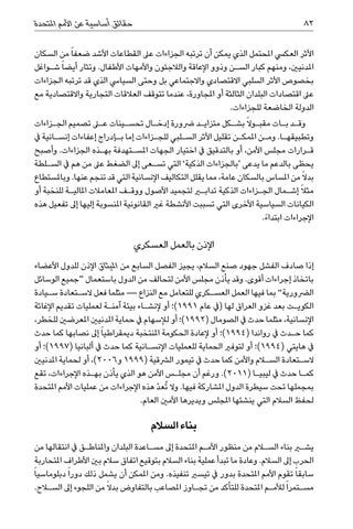 األثر العكيس املحتمل الذي يمكن أن ترتبه الجزاءات عىل القطاعات األشد ضعفا ً من السكان املدنيني ،ومنهم كبار الس�ن وذوو اإلعاقة والالجئون واألمهات األطفال .وتثار أيضا ً ش�واغل بخصوص األثر السلبي االقتصادي واالجتماعي بل وحتى السيايس الذي قد ترتبه الجزاءات عىل اقتصادات البلدان الثالثة أو املجاورة ،عندما تتوقف العالقات التجارية واالقتصادية مع الدولة الخاضعة للجزاءات. وق�د ب�ات مقب�وال ً بش�كل متزاي�د رضورة إدخ�ال تحس�ينات على تصميم الج�زاءات وتطبيقه�ا .وم�ن املمك�ن تقليل األثر الس�لبي للج�زاءات إما ب�إدراج إعفاءات إنس�انية يف ق�رارات مجلس األمن ،أو بالتدقيق يف اختيار الجهات املس�تهدفة به�ذه الجزاءات .وأصبح يحظى بالدعم ما يدعى ‘بالجزاءات الذكية’ التي تس�عى إىل الضغط عىل من هم يف الس�لطة بدال ً من املساس بالسكان عامة ،مما يقلل التكاليف اإلنسانية التي قد تنجم عنها .وباملستطاع مثالً إش�مال الج�زاءات الذكية تدابير لتجميد األصول ووق�ف املعامالت املالي�ة للنخبة أو الكيانات السياسية األخرى التي تسببت األنشطة غري القانونية املنسوبة إليها إىل تفعيل هذه اإلجراءات ابتداءً.