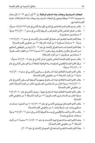 البعثات السياسية وبعثات بناء السالم الراهنة .يف 31أيار/مايو ،2013كان هناك ما مجموعه 3 825موظفا ً يعملون يف البعثات السياس�ية وبعثات بناء السالم الثالث عرشة الواردة فيما ييل: • •مكتب منسق األمم املتحدة الخاص يف الرشق األوسط (أنشئ يف عام )1999؛ ( 58مدنياً)؛ • •مكت�ب املمثل الخاص لألمني العام لغرب أفريقيا (أنش�ئ يف ع�ام )2001؛ ( 39مدنياً؛ 3مستشارين عسكريني)؛ • •بعثة األمم املتحدة لتقديم املس�اعدة إىل أفغانس�تان (أنش�ئت يف ع�ام 1 734( )2002 مدنياً؛ 20مستشارا ً عسكرياً؛ 5من أفراد الرشطة؛ 66من متطوعي األمم املتحدة)؛ • •بعثة األمم املتحدة ملس�اعدة العراق (أنشئت يف عام )2003؛ (يمارس املوظفون أعمالهم م�ن الع�راق واألردن والكويت ويش�ملون 816 :مدني�اً؛ 272من القوات العس�كرية؛ 5مستشارين عسكريني؛ 4من أفراد الرشطة)؛ • •مكتب منسق األمم املتحدة الخاص لشؤون لبنان (أنشئ يف عام 81( )2007مدنياً)؛ • •مركز األمم املتحدة اإلقليمي للدبلوماس�ية الوقائية ملنطقة آس�يا الوسطى (أنشئ يف عام )2007؛ ( 29مدنياً)؛ • •مكتب األمم املتحدة املتكامل لبناء السلام يف سيراليون (أنش�ئ يف ع�ام )2008؛ (55 مدنياً؛ 6من أفراد الرشطة؛ 7من متطوعي األمم املتحدة)؛ • •مكتب األمم املتحدة املتكامل لبناء السلام يف جمهورية أفريقيا الوس�طى (أنشئ يف عام )2010؛ ( 144مدنياً؛ اثنان من املستشارين العسكريني؛ اثنان من أفراد الرشطة؛ اثنان من متطوعي األمم املتحدة)؛ • •مكتب األمم املتحدة املتكامل لبناء السالم يف غينيا -بيساو (أنشئ يف عام )2010؛ (98 مدنياً؛ اثنان من املستش�ارين العس�كريني؛ 12من أفراد الرشطة؛ 6من متطوعي األمم املتحدة)؛ • •مكتب األمم املتحدة يف بوروندي (أنش�ئ يف عام )2011؛ ( 105من املدنيني؛ مستش�ار عسكري واحد؛ فرد رشطة واحد؛ 4من متطوعي األمم املتحدة)؛ • •مكت�ب األم�م املتح�دة اإلقليمي يف وس�ط أفريقيا (أنش�ئ يف ع�ام )2011؛ ( 25مدنياً؛ مستشار عسكري واحد)؛ • •بعث�ة األمم املتح�دة للدعم يف ليبيا (أنش�ئت يف عام )2011؛ ( 210مدني�اً؛ 7من أفراد الرشطة؛ 3من متطوعي األمم املتحدة)؛