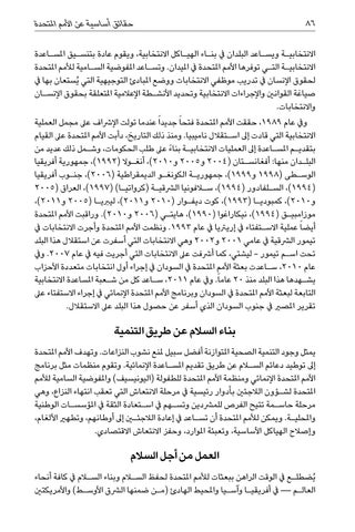 االنتخابي�ة ويس�اعد البلدان يف بن�اء الهي�اكل االنتخابية ،ويقوم عادة بتنس�يق املس�اعدة االنتخابي�ة الت�ي توفرها األمم املتحدة يف امليدان .وتس�اعد املفوضية الس�امية لألمم املتحدة لحقوق اإلنسان يف تدريب موظفي االنتخابات ووضع املبادئ التوجيهية التي ُيستعان بها يف صياغة القوانني واإلجراءات االنتخابية وتحديد األنش�طة اإلعالمية املتعلقة بحقوق اإلنس�ان واالنتخابات. ويف عام ،1989حققت األمم املتحدة فتحا ً جديدا ً عندما تولت اإلرشاف عىل مجمل العملية االنتخابية التي قادت إىل اس�تقالل ناميبيا .ومنذ ذلك التاريخ ،دأبت األمم املتحدة عىل القيام بتقدي�م املس�اعدة إىل العمليات االنتخابي�ة بنا ًء عىل طلب الحكومات ،وش�مل ذلك عديد من البل�دان منها :أفغانس�تان ( 2004و 2005و ،)2010أنغ�وال ( ،)1992جمهورية أفريقيا الوس�طى ( 1998و ،)1999جمهوري�ة الكونغ�و الديمقراطية ( ،)2006جن�وب أفريقيا ( ،)1994الس�لفادور ( ،)1994سلافونيا الرشقي�ة (كرواتي�ا) ( ،)1997العراق (2005 و ،)2010كمبودي�ا ( ،)1993كوت ديف�وار ( 2010و ،)2011ليربي�ا ( 2005و،)2011 موزامبي�ق ( ،)1994نيكاراغوا ( ،)1990هايت�ي ( 2006و .)2010وراقبت األمم املتحدة أيضا ً عملية االس�تفتاء يف إريرتيا يف عام .1993ونظمت األمم املتحدة وأجرت االنتخابات يف تيمور الرشقية يف عامي 2001و 2002وهي االنتخابات التي أسفرت عن استقالل هذا البلد تحت اس�م تيمور -ليشتي ،كما أرشفت عىل االنتخابات التي أجريت فيه يف عام .2007ويف عام ،2010س�اعدت بعثة األمم املتحدة يف السودان يف إجراء أول انتخابات متعددة األحزاب يش�هدها هذا البلد منذ 20عاماً .ويف عام ،2011س�اعد كل من ش�عبة املساعدة االنتخابية التابعة لبعثة األمم املتحدة يف السودان وبرنامج األمم املتحدة اإلنمائي يف إجراء االستفتاء عىل تقرير املصري يف جنوب السودان الذي أسفر عن حصول هذا البلد عىل االستقالل.