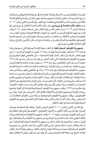 املؤسسات الوطنية وتدريب الرشطة وإضفاء طابع احرتايف عىل قوة الدفاع الوطني واستكمال ترسيح املحاربني الس�ابقني وإعادة إدماجهم وحماية حقوق اإلنسان وإصالح قطاع العدالة والقان�ون وتعزيز النم�و االقتصادي والقضاء عىل الفقر .ويف كان�ون الثاني/يناير ،2011 ح�ل مكتب األمم املتحدة يف بوروندي محل مكتب األمم املتحدة املتكامل يف بوروندي .ويف ش�باط/فرباير ،2013م�دّد مجلس األم�ن والية املكتب حتى ش�باط/فرباير 2014وطلب إليه دعم جهود الحكومة يف تيسير الحوار بني الجهات الفاعلة الوطنية؛ وتعزيز املؤسس�ات الوطني�ة؛ ومحارب�ة اإلفالت من العق�اب؛ وتعزيز وحماية حقوق اإلنس�ان؛ وتدعيم التنمية االجتماعية واالقتصادية للمرأة والش�باب؛ وإعادة إدماج الس�كان املتأثرين بالنزاع؛ وزيادة آفاق التكامل اإلقليمي لبوروندي. جمهورية الكونغو الديمقراطية .يف أعقاب عملية اإلبادة الجماعية التي ش�هدتها رواندا يف عام 1994وتشكيل حكومة جديدة فيها ،فر زهاء 1,2مليون من الهوتو الروانديني — بمن فيهم عنارص شاركت يف ارتكاب أعمال اإلبادة الجماعية — إىل مقاطعتي كيفو املجاورتني يف جمهورية الكونغو الديمقراطية ،التي كانت ُتعرف من قبل باس�م زائري .وش�هد عام 1996 عملي�ة تم�رد يف هاتني املقاطعتني .ويف عام ،1997س�يطرت قوات خاضع�ة لقيادة لوران ديزيريه كابيال ،بمساعدة من رواندا وأوغندا ،عىل العاصمة كينشاسا وأعادت تسمية البلد إىل جمهوري�ة الكونغو الديمقراطية .ويف عام ،1998بدأت يف مقاطعتي كيفو حركة تمرد ضد حكومة كابيال ،يقودها التجمع الكونغويل من أجل الديمقراطية .واستوىل متمردون بمساعدة رواندا وأوغندا عىل قطاعات كبرية من البلد .ووعدت أنغوال وتشاد وناميبيا وزمبابوي بتقديم الدع�م العس�كري للرئيس كابيال ،لكن املتمردين اس�تمروا يف إح�كام قبضتهم عىل املناطق الرشقي�ة من الكونغو .ودعا مجلس األمن إىل وقف إطالق النار وانس�حاب القوات األجنبية. ويف مطل�ع عام ،1999و ّقعت جمهوري�ة الكونغو الديمقراطية إضاف�ة إىل أنغوال وناميبيا ورواندا وأوغندا وزمبابوي اتفاق لوساكا لوقف إطالق النار ،الذي نص عىل إجراء حوار بني الكونغوليني .وو ّقعت جمهورية الكونغو الديمقراطية وحركة تحرير الكونغو اتفاقا ً يف آب/ أغس�طس .وعقب ذلك ،أنش�أ مجلس األمن بعثة منظمة األمم املتحدة يف جمهورية الكونغو الديمقراطية للمساعدة يف تنفيذ االتفاق. ويف كان�ون الثاني/يناي�ر ،2001اغتي�ل الرئيس كابيال .وخلف�ه يف الحكم ابنه جوزيف كابيلا .ويف ترشي�ن األول/أكتوبر بدأ الحوار الكونغويل -الكونغ�ويل الذي طال انتظاره يف أديس أبابا بإثيوبيا .ويف تموز/يوليه ،2002و ّقعت جمهورية الكونغو الديمقراطية ورواندا اتفاق�ا ً يقيض بانس�حاب املحاربين الروانديني من جمهوري�ة الكونغ�و الديمقراطية .ويف أيلول/سبتمرب تم التوصل إىل اتفاق مماثل بني جمهورية الكونغو الديمقراطية وأوغندا .غري أن االش�تباكات تجددت ثانية بحلول ترشين األول/أكتوب�ر يف الجزء الرشقي من جمهورية الكونغو الديمقراطية مهددة بزعزعة االستقرار يف البلد بأكمله .وبحلول نهاية السنة ،وافقت أطراف النزاع بوس�اطة األمم املتحدة وجنوب أفريقيا ،عىل تش�كيل حكوم�ة انتقالية .وقام