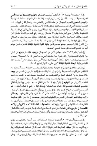 ويف 27حزيران/يوني�ه ،2011أنش�أ مجل�س األمن قوة األمم املتح�دة املؤقتة ألبيي لفرتة مبدئية مدتها س�تة أشهر وكلّفها بوالية رصد إعادة انتشار القوات املسلحة السودانية والجيش الشعبي لتحرير السودان من منطقة أبيي والتحقق منه؛ واملشاركة يف الهيئات ذات الصل�ة ملنطقة أبيي؛ وتقديم مس�اعدة تتعلق بإزالة األلغام وتوفري خدمات تقنية؛ وتيسير تس�ليم املعونة اإلنس�انية؛ وتعزيز قدرة دائرة رشطة أبيي؛ وتوفري األمن للهياكل األساس�ية النفطي�ة بالتعاون م�ع الرشط�ة .ويف 29حزيران/يونيه ،و ّقع الطرفان اتفاقا ً بش�أن أمن الحدود واآللية السياسية واألمنية املشرتكة ينص عىل إنشاء منطقة حدودية منزوعة السالح ويطل�ب إىل قوة األمم املتحدة املؤقتة ألبيي توفري الحماية لبعثة تحقق دولية لرصد الحدود. وسع مجلس األمن والية القوة األمنية املؤقتة لتشمل ،ضمن مهام ويف كانون األول/ديسمربّ ، أخرى ،تقديم املساعدة يف عملية تطبيع الحدود. ويف أيار/مايو ،2012طلب مجلس األمن من الس�ودان أن يعيد انتش�ار جميع من تبقى من األفراد العس�كريني والرشطيني م�ن منطقة أبيي ،وقد انتهى كل من الس�ودان وجنوب الس�ودان من إنش�اء إدارة منطقة أبيي ودائرة رشطة أبيي .ويف ترشين الثاني/نوفمرب مدد املجلس والية البعثة األمنية املؤقتة ألبيي حتى 31أيار/مايو .2013 دارف�ور .تتفاع�ل التوت�رات العرقية واالقتصادية والسياس�ية القائمة من�ذ أمد بعيد مع التنافس عىل املوارد الش�حيحة وت�ؤدي إىل تغذية العنف يف إقليم دارفور يف الس�ودان .وبعد ثالث س�نوات من العن�ف الضاري انخرط�ت فيه الحكوم�ة وجيش تحرير الس�ودان/عبد الواحد ،وحركة العدل واملس�اواة والجنجويد وميليش�يات أخرى ،أسفرت الجهود التي بذلها االتحاد األفريقي عن التوقيع يف أيار/مايو 2006عىل اتفاق سلام دارفور .ويتناول االتفاق تقاس�م السلطة وتقاس�م الثروة والوقف الش�امل إلطالق النار ووضع ترتيبات أمنية .ورغم أن جمي�ع أط�راف النزاع كانت حارضة االجتم�اع ،لم تو ّقع االتفاق س�وى الحكومة وجيش تحري�ر الس�ودان/عبد الواحد .ويف آب/أغس�طس 2006أذن مجلس األمن بتوس�يع نطاق والي�ة بعثة األمم املتحدة يف الس�ودان لتمكينه�ا من نرش عنارصها يف دارف�ور .لكن حكومة الس�ودان اعرتضت عىل نرش حفظة السالم التابعني لألمم املتحدة يف املنطقة .وبعد أشهر من املفاوضات أنشأ املجلس يف تموز/يوليه 2007العملية املختلطة لالتحاد األفريقي واألمم املتح�دة يف دارفور ،لكي تتعامل عىل نحو ش�امل مع الحالة يف دارف�ور ،وكانت بذلك تمثل أول قوة مختلطة تش�ارك فيها األمم املتحدة ،وأكرب عملية لحفظ السلام تابعة لألمم املتحدة عىل اإلطالق. ويف نيس�ان/أبريل ،2007أصدرت املحكمة الجنائية الدولي�ة أمرين بالقبض عىل وزير الدولة السابق للشؤون الداخلية وقائد ميليشيا الجنجويد بتهمة ارتكاب جرائم ضد اإلنسانية وجرائم حرب .لكن موقف الحكومة السودانية إزاء ذلك ذهب إىل أن املحكمة الجنائية الدولية غري ذات اختصاص بمحاكمة املواطنني الس�ودانيني وأنها لن تسلّم الشخصني املذكورين إىل أي س�لطات يف الهاي .ويف عام ،2008وجهت املحكمة الجنائية الدولية إىل رئيس الس�ودان ّ