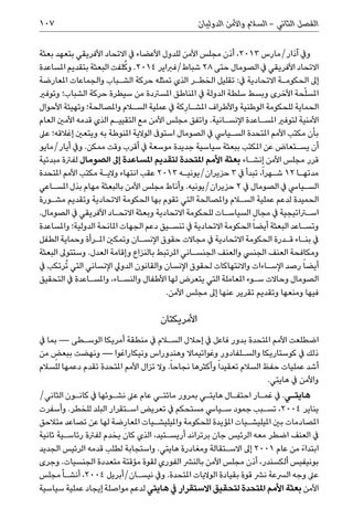ويف آذار/مارس ،2013أذن مجلس األمن للدول األعضاء يف االتحاد األفريقي بتعهد بعثة االتحاد األفريقي يف الصومال حتى 28شباط/فرباير ُ .2014 وكلفت البعثة بتقديم املساعدة إىل الحكوم�ة االتحادية يف :تقليل الخط�ر الذي تمثله حركة الش�باب والجماعات املعارضة املسلّحة األخرى وبسط سلطة الدولة يف املناطق املسرتدة من سيطرة حركة الشباب؛ وتوفري الحماية للحكومة الوطنية واألطراف املش�ا ِركة يف عملية السلام واملصالحة؛ وتهيئة األحوال األمنية لتوفري املس�اعدة اإلنس�انية .واتفق مجلس األمن مع التقيي�م الذي قدمه األمني العام بأن مكتب األمم املتحدة الس�يايس يف الصومال استوىف الوالية املنوطة به ويتعني إغالقه؛ عىل أن يس�تعاض عن املكتب ببعثة سياسية جديدة موسعة يف أقرب وقت ممكن .ويف أيار/مايو قرر مجلس األمن إنش�اء بعثة األمم املتحدة لتقديم املساعدة إىل الصومال لفرتة مبدئية مدته�ا 12ش�هراً ،تبدأ يف 3حزيران/يوني�ه 2013عقب انتهاء والي�ة مكتب األمم املتحدة الس�يايس يف الصومال يف 2حزيران/يونيه .وأناط مجلس األمن بالبعثة مهام بذل املس�اعي الحميدة لدعم عملية السلام واملصالحة التي تقوم بها الحكومة االتحادية وتقديم مش�ورة استراتيجية يف مجال السياس�ات للحكومة االتحادية وبعثة االتح�اد األفريقي يف الصومال. وتس�اعد البعثة أيضا ً الحكومة االتحادية يف تنس�يق دعم الجهات املانحة الدولية؛ واملساعدة يف بن�اء ق�درة الحكومة االتحادية يف مجاالت حقوق اإلنس�ان وتمكني امل�رأة وحماية الطفل ومكافحة العنف الجنيس والعنف الجنس�اني املرتبط بالنزاع وإقامة العدل .وستتوىل البعثة أيضا ً رصد اإلس�اءات واالنتهاكات لحقوق اإلنسان والقانون الدويل اإلنساني التي ُترتكب يف الصومال وحاالت س�وء املعاملة التي يتعرض لها األطفال والنس�اء ،واملس�اعدة يف التحقيق فيها ومنعها وتقديم تقرير عنها إىل مجلس األمن.