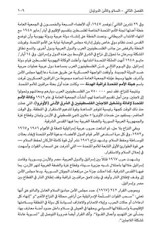ويف 29ترشين الثاني/نوفمرب ،1947أ ّيد األعضاء الس�بعة والخمس�ون يف الجمعية العامة خطة أعدتها لجنة األمم املتحدة الخاصة لفلس�طني بتقسيم اإلقليم يف أيار/مايو 1948مع انتهاء االنتداب الربيطاني .ونصت الخطة عىل إنش�اء دولة عربية ودولة يهودية وأن توضع القدس تحت نظام دويل خاص يتوىل إدارته مجلس الوصاية نيابة عن األمم املتحدة .وقوبلت الخطة بالرفض من جانب الفلس�طينيني العرب والدول العربية ودول أخرى .واتسع نطاق املشكلة ورسعان ما تح ّول إىل نزاع يف الرشق األوسط بني هذه الدول وإرسائيل .ويف 14أيار/ ماي�و 1948أنهت اململكة املتح�دة انتدابها ،وأعلنت الوكالة اليهودية لفلس�طني قيام دولة إرسائيل .ويف اليـوم التالـي ّ ش�ن الفلسطينيون العرب بمساعدة دول عربية عمليات حربية ض�د الدولة الجديدة .وأُوقفت املواجهة العس�كرية عن طريق هدن�ة دعا إليها مجلس األمن وأرشف عليها وسيط عيّنته الجمعية العامة تساعده مجموعة من املراقبني العسكريني عُرفت باسم هيئة األمم املتحدة ملراقبة الهدنة — وكانت هذه أول بعثة مراقبني لألمم املتحدة. ونتيجة للنزاع ،فقد نحو 750 000من الفلس�طينيني العرب ديارهم ومعاشهم وتحولوا إىل الجئني .ومن أجل تقديم املساعدة لهم ،أنشأت الجمعية العامة يف عام 1949وكالة األمم املتحدة إلغاثة وتشغيل الالجئني الفلسطينيني يف الرشق األدنى (األونروا) ،التي عملت منذ ذلك الوقت كجهة رئيسية لتوفري املساعدة وقوة لتدعيم االستقرار يف املنطقة .ويف الوقت الحارض ،يستفيد من خدمات األونروا 5ماليني الجئ فلسطيني يف األردن ولبنان وقطاع غزة والجمهورية العربية السورية والضفة الغربية بما فيها القدس الرشقية. وبقي النزاع بال حل ،ثم اندلعت حروب عربية إرسائيلية الحقة يف األعوام 1956و1967 و ،1973ويف كل مرة اس�تدعى األمر قيام الدول األعض�اء بدعوة األمم املتحدة إليفاد بعثات للوس�اطة وحفظ السالم .وش�هد نزاع 1956نرش أول قوة كاملة األركان لحفظ السالم — هي قوة الطوارئ األوىل التابعة لألمم املتحدة — التي أرشفت عىل انسحاب القوات وأسهمت يف إحالل السالم واالستقرار. وش�هدت حرب 1967قتاال ً بني إرسائيل والدول العربية ،مرص واألردن وس�وريا ،وقامت إرسائيل خاللها باحتالل ش�به جزيرة س�يناء وقطاع غزة والضفة الغربية لنهر األردن ،بما فيه�ا القدس الرشقية ،كما احتلت جزءًا من مرتفعات الجوالن الس�ورية .ودعا مجلس األمن إىل وق�ف إلطالق النار وأوفد يف وقت الحق مراقبين ملراقبة وقف إطالق النار يف القطاع بني مرص وإرسائيل. وبموجب القرار ،)1967( 242حدد مجلس األمن مبادئ السالم العادل والدائم عىل أنها أراض محتلة يف النزاع األخري”و “إنهاء كل تعني“ :س�حب القوات املس�لّحة اإلرسائيلية من ٍ ادعاءات أو حاالت الحرب ،وإيالء االحرتام واالعرتاف لس�يادة كل دولة يف املنطقة وسلامتها اإلقليمي�ة واس�تقاللها الس�يايس وحقها يف العيش يف سلام داخل حدود آمن�ة معرتف بها، بمن�أى عن التهديد وأعمال الق�وة” .وأكد القرار أيضا ً رضورة التوصل إىل “تس�وية عادلة ملشكلة الالجئني”.