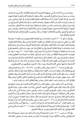 وبالرغ�م م�ن النداءات الت�ي وجهتها املجموع�ة الرباعية واألطراف األخ�رى ،لم تعرتف حماس رس�ميا ً بح�ق إرسائيل يف الوج�ود .وكان موقف الحكومة اإلرسائيلي�ة بقيادة إيهود أومليرت يف ذلك الوقت اعتبار أن الس�لطة الفلس�طينية كلها تحول�ت إىل كيان إرهابي ،ومن ثم ج ّمدت إيرادات الرضائب الفلس�طينية .وتصاعد العنف بما يف ذلك إطالق الصواريخ من غزة عىل إرسائيل ،وما صاحب ذلك من عمليات إرسائيلية مضادة واس�عة النطاق .وعارضت الجهات الدولية املانحة تمويل حكومة بقيادة حماس طاملا أنها لم تنبذ العنف وتعرتف بحق إرسائيل يف الوجود وتلتزم باالتفاقات املوقعة س�لفاً .وتدهورت األوضاع اإلنسانية يف الضفة الغربية وقطاع غزة. ويف أيار/مايو ،2007أسفرت املصادمات بني الفرقاء الفلسطينيني عن مقتل 68وإصابة أكثر من مائتي ش�خص يف غمار التقاتل بني القوات األمنية لحماس والس�لطة الفلسطينية. ونتيجة لذلك ،انتهت الس�لطة الفلس�طينية إىل حكم الضفة الغربية ،وحماس إىل حكم قطاع غ�زة .وتصاعدت عملية إطالق الصواريخ من قطاع غزة عىل جنوب إرسائيل ،وأعقبها وقوع رضب�ات إرسائيلية اس�تهدفت املحاربني وأرسهم .وقرب نهاية عام ،2008وبعد س�يل من الهجمات الصاروخية املُطلَقة من غزة ،ش�نت إرسائيل عملية عس�كرية ضد القطاع وصلت ذروته�ا باجتي�اح بري .وأدت العملي�ة إىل زيادة تدهور الحالة اإلنس�انية يف غزة وتش�ديد الحص�ار ال�ذي ُفرض عليه�ا قبل ذلك بثالث س�نوات؛ ونجم عن ذلك دمار ش�ديد يف البنية األساسية بما فيها مباني األمم املتحدة؛ وموت مئات املدنيني معظمهم من الفلسطينيني. ويف مطل�ع ع�ام ،2009اتخذ مجلس األم�ن الق�رار .)2009( 1860ودعا فيه إىل وقف فوري إلطالق النار يعقبه انس�حاب القوات اإلرسائيلية من قطاع غزة ،وأدان العنف وأعمال اإلرهاب .واس�تهل األمني العام مهمة إىل الرشق األوس�ط من أج�ل التوصل إىل وقف إلطالق النار .وبعد جهود دبلوماس�ية مكثفة أعلنت إرسائي�ل يف منتصف كانون الثاني/يناير وقفا ً إلطالق النار من طرف واحد ،أعقبه إعالن حماس وقفا ً إلطالق النار من طرف واحد. ويف الش�هر ذاته ،وافق مجلس حقوق اإلنس�ان التابع لألمم املتحدة عىل إجراء تحقيق يف النزاع ،تاله بوقت قليل تعيني القايض الجنوب أفريقي ريتش�ارد غولدس�تون رئيسا ً لفريق التحقي�ق .وصدر تقرير الفريق يف أيلول/س�بتمرب وأوىص ،ضمن جمل�ة أمور ،بأن يراقب مجلس األمن تحقيقات تجريها إرسائيل والس�لطات يف غزة .وخلص التقرير إىل أن الجانبني ارتكب�ا انته�اكات تصل إىل مص�اف الجرائم ضد اإلنس�انية .وبعد انقضاء ش�هرين ،أيدت الجمعي�ة العامة يف الق�رار 10/64تقرير غولدس�تون وطلبت إىل األمني الع�ام أن يفيدها ع�ن تنفيذ القرار “من أجل النظر يف اتخ�اذ إجراءات أخرى ...بما فيها [من خالل] مجلس األمن” .ويف اجتماع عقدته املجموعة الرباعية يف أيلول/سبتمرب ،2009دُعيت إرسائيل ودُعي الفلسطينيون إىل تنفيذ التزاماتهم بموجب خريطة الطريق. ويف آذار/م�ارس ،2010حث�ت املجموعة الرباعي�ة إرسائيل عىل تجميد جميع النش�اط أي إجراءات ُتتخذ من طرف واحد لن تحظى باالعرتاف االستيطاني ،وأعادت التأكيد عىل أن ّ