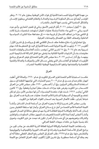 العراق عكس�ت اس�تجابة األمم املتحدة لغزو الع�راق للكويت يف ع�ام ،1990وللحالة التي أعقبت انهيار نظام صدام حسين يف ع�ام 2003حجم التحدّيات التي تواجهها املنظمة يف س�بيل اس�تعادة السالم واألمن الدوليني .ويف آب/أغس�طس ،1990طلب مجلس األمن من العراق االنس�حاب من الكويت وفرض عليه جزاءات ش�ملت حظرا ً تجاريا ً ونفطياً .ويف 16كانون الثاني/يناي�ر ،1991ش�نت قوات متعددة الجنس�يات أذن لها مجل�س األمن ،وإن لم تكن تخض�ع للتوجيه أو الس�يطرة املب�ارشة لألمم املتحدة ،عمليات عس�كرية ض�د العراق .ويف شباط/فرباير ،علِّقت األعمال الحربية بعد انسحاب القوات العراقية من الكويت. وق�رر مجلس األمن رضورة إزالة ما يحوزه العراق من أس�لحة للدمار الش�امل ،وأنش�أ اللجنة الخاصة لألمم املتحدة من أجل نزع سلاح العراق ،وأجاز لها س�لطة التفتيش بدون إن�ذار ،كم�ا أناط بالوكال�ة الدولية للطاق�ة الذرية مه�ام تحقق مماثلة يف املج�ال النووي. وأنش�أ املجلس أيضا ً لجنة األمم املتحدة للتعويض�ات لتجهيز مطالب الحكومات واملواطنني أي خس�ارة أو أرضار تكون قد نجمت عن غزو الكويت ،وتمويل والرشكات وتعويضهم عن ّ ذلك بنسبة مئوية من عائدات مبيعات النفط العراقي. واس�تطاعت اللجنة الخاصة والوكالة الدولية للطاقة الذرية الكش�ف عن جانب كبري من برامج العراق لألس�لحة املحظ�ورة وقدراته يف املج�االت النووية والكيميائي�ة والبيولوجية والتخل�ص منها .ويف ع�ام ،1998طلب العراق إىل املجلس رفع الحظر النفطي معلنا ً أنه لم أي أس�لحة محظورة .ويف ترشين األول/أكتوبر ،أوقف العراق التعامل مع اللجنة يعد يملك ّ