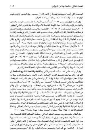 وجهت الخاص�ة التي أنج�زت مهمتها األخرية يف كانون األول/ديس�مرب .ويف الش�هر ذاتهّ ، الواليات املتحدة واململكة املتحدة رضبات جوية ضد العراق. ويف كانون األول/ديس�مرب ،1999أنش�أ مجلس األمن لجنة األمم املتحدة للرصد والتحقق والتفتي�ش (إنموفيك) لتحل محل اللجنة الخاصة لألم�م املتحدة .ويف ترشين الثاني/نوفمرب ،2002اتخ�ذ املجلس قراره )2002( 1441لتطبيق نظام معزز للتفتيش مع إعطاء العراق فرصة أخرية لالمتثال لقرارات املجلس .وعاد مفتش�و األمم املتحدة إىل العراق و ُقدمت إفادات يس لجنة األمم املتحدة للرصد والتحقق والتفتيش (إنموفيك) متك�ررة إىل املجلس من ِقبَل رئي ّ واملدي�ر العام للوكال�ة الدولية للطاقة الذري�ة .ويف منتصف عملية التف�اوض ،وخارج إطار مجلس األمن ،حددت إس�بانيا واململكة املتحدة والواليات املتحدة للعراق يوم 17آذار/مارس 2003حدّا ً زمنيا ً فاصالً لنزع سالحه نزعا ً تاماً .ومع اقرتاب موعد العمل العسكري ،أمر األمني العام بس�حب مفتيش األمم املتحدة يوم 17آذار/مارس وتعليق جميع العمليات .وبعد ثالثة أيام بدأ العمل العسكري للتحالف الذي تزعمته اململكة املتحدة والواليات املتحدة .ويف أعقاب س�قوط نظام صدام حسين ،اتخذ مجلس األمن يف أيار/مايو القرار ،)2003( 1483الذي أكد فيه حق شعب العراق يف تقرير مستقبله السيايس .واعرتف القرار بسلطات ومسؤوليات والتزامات التحالف (‘السلطة’) ،لحني تويل حكومة معرتف بها دوليا ً مقاليد األمور .كما رفع الجزاءات الدولية وأتاح األس�اس القانوني الس�تئناف عمليات األمم املتحدة يف العراق. ويف آب/أغس�طس ،2003أنش�أ مجلس األمن بعثة األمم املتحدة لتقديم املساعدة إىل العراق ،وأناط بها والية تنس�يق املعونة اإلنسانية وإعادة اإلعمار واملساعدة يف إقامة حكومة عراقية معرتف بها دوليا ً ذات سيادة .ويف 19آب/أغسطس ،كان مقر األمم املتحدة يف بغداد هدفا ً لهجوم إرهابي تس�بب يف وفاة 22شخصا ً وجرح أكثر من 150آخرين .وكان من بني القتىل 15من موظفي األمم املتحدة بمن فيهم رئيس البعثة ،سيرجيو فيريا دي ميللو .وقام األمين العام بس�حب معظم املوظفني الدوليين من بغداد وأبقى على فريق صغري معظمه من العراقيني لتوفري املس�اعدات اإلنسانية األساسية بما يف ذلك توفري األغذية واملاء والرعاية الصحية .ويف ترشين األول/أكتوبر ،أذن مجلس األمن بإنش�اء قوة متعددة الجنسيات تحت قيادة موحدة من أجل اتخاذ جميع التدابري الرضورية للمساهمة يف صون السالم واالستقرار يف العراق ،وكفالة األمن ملوظفي بعثة األمم املتحدة لتقديم املس�اعدة إىل العراق ومؤسس�ات اإلدارة العراقية االنتقالية .ويف ترشين الثاني/نوفمرب توصل مجلس الحكم العراقي وسلطة التحالف املؤقتة إىل اتفاق بشأن استعادة السيادة بحلول نهاية حزيران/يونيه .2004 ويف أعقاب طلب مقدم من مجلس الحكم العراقي وس�لطة التحالف املؤقتة للحصول عىل مس�اعدة األمم املتحدة يف االنتقال إىل الس�يادة ،أوفد األمني العام فريقا ً للمساعدة االنتخابية م�ن أجل تقييم االحتياجات الالزمة إلجراء انتخاب�ات ذات مصداقية يف كانون الثاني/يناير .2005وطلب أيضا ً من مستشاره الخاص بشأن العراق ،الذي وصل إىل العراق يف نيسان/ س�مى مجلس أبريل ،2004للعمل مع العراقيني بخصوص هذه الرتتيبات .ويف أيار/مايوّ ،