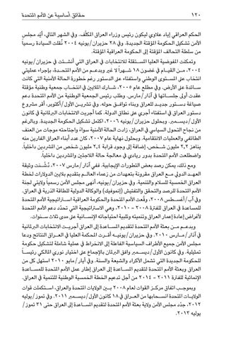 الحكم العراقي إياد عالوي ليكون رئيس وزراء العراق املكلّف .ويف الشهر التايل ،أ ّيد مجلس األمن تشكيل الحكومة املؤقتة الجديدة .ويف 28حزيران/يونيه ُ 2004نقلت السيادة رسميا ً من سلطة التحالف املؤقتة إىل الحكومة العراقية املؤقتة. وتمكنت املفوضية العليا املس�تقلة لالنتخابات يف العراق التي أنش�ئت يف حزيران/يونيه ،2004م�ن القي�ام يف غضون 18ش�هرا ً ال غري وبدع�م من األمم املتح�دة ،بإجراء عمليتي انتخاب عىل املس�توى الوطني واستفتاء عىل الدستور رغم خطورة الحالة األمنية التي كانت س�ائدة عىل األرض .ويف مطلع عام ،2005ش�ارك املاليني يف انتخ�اب جمعية وطنية مؤقتة عقدت أوىل جلس�اتها يف آذار/مارس .وطلب رئيس الجمعية الوطنية من األمم املتحدة دعم صياغة دس�تور جدي�د للعراق وبناء تواف�ق حوله .ويف ترشي�ن األول/أكتوبر ،أقر مرشوع دستور العراق يف استفتاء أجري عىل نطاق الدولة .كما أجريت االنتخابات الربملانية يف كانون األول/ديس�مرب .وبحلول حزيران/يونيه ،2006اكتمل تشكيل الحكومة الجديدة .وبالرغم من نجاح التحول السيايس يف العراق ،زادت الحالة األمنية سوا ًء واجتاحته موجات من العنف الطائفي والعمليات االنتقامية .وبحلول نهاية عام ،2007كان عدد أبناء العراق الفارين منه يناهز 2,2مليون ش�خص ،إضافة إىل وجود قرابة 2,4مليون شخص من املرشدين داخلياً. واضطلعت األمم املتحدة بدور ريادي يف معالجة حالة الالجئني واملرشدين داخلياً. ومع ذلك ،يمكن رصد بعض التطورات اإليجابية .ففي آذار/مارس ،2007د ّ ُش�نت وثيقة العه�د الدويل م�ع العراق مقرونة بتعهدات من زعماء العال�م بتقديم باليني الدوالرات لخطة العراق الخمسية للسالم والتنمية .ويف حزيران/يونيه ،أنهى مجلس األمن رسميا ً واليتي لجنة األمم املتحدة للرصد والتحقق والتفتيش (إنموفيك) والوكالة الدولية للطاقة الذرية يف العراق. ويف آب/أغس�طس ،2008و ّقعت األمم املتحدة والحكومة العراقية استراتيجية األمم املتحدة للمساعدة يف العراق للفرتة ،2010 - 2008وهي االسرتاتيجية التي تحدّد دعم األمم املتحدة ألغراض إعادة إعمار العراق وتنميته وتلبية احتياجاته اإلنس�انية عىل مدى ثالث س�نوات. وبدع�م م�ن بعثة األمم املتحدة لتقديم املس�اعدة إىل العراق أجري�ت االنتخابات الربملانية يف آذار/م�ارس .2010ويف حزيران/يوني�ه أق�رت املحكمة العليا يف الع�راق النتائج ودعا مجلس األمن جميع األطراف السياسية الفاعلة إىل االنخراط يف عملية شاملة لتشكيل حكومة تمثيلية .ويف كانون األول/ديس�مرب وافق الربملان باإلجماع عىل اختيار نوري املالكي رئيس�ا ً للحكومة الجديدة التي تشمل األكراد والشيعة والسنة .ويف أيار/مايو 2010استهل كل من العراق وبعثة األمم املتحدة لتقديم املس�اعدة إىل العراق إطار عمل األمم املتحدة للمس�اعدة اإلنمائية للفرتة 2014 - 2011من أجل تدعيم الخطة الخمسية الوطنية للتنمية يف العراق. وبموج�ب اتفاق مرك�ز القوات لعام 2008بين الواليات املتحدة والعراق ،اس�تكملت قوات الوالي�ات املتحدة انس�حابها من الع�راق يف 18كانون األول/ديس�مرب .2011ويف تموز/يوليه ،2012جدّد مجلس األمن والية بعثة األمم املتحدة لتقديم املس�اعدة إىل العراق حتى 31تموز/ يوليه .2013