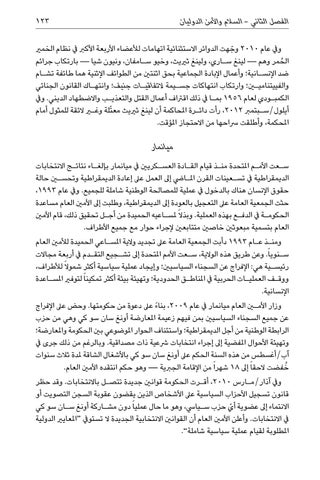 ميانمار س�عت األم�م املتحدة من�ذ قيام الق�ادة العس�كريني يف ميانمار بإلغ�اء نتائ�ج االنتخابات الديمقراطية يف تس�عينات القرن امل�ايض إىل العمل عىل إعادة الديمقراطية وتحسين حالة حقوق اإلنسان هناك بالدخول يف عملية للمصالحة الوطنية شاملة للجميع .ويف عام ،1993 حثت الجمعية العامة عىل التعجيل بالعودة إىل الديمقراطية ،وطلبت إىل األمني العام مساعدة الحكوم�ة يف الدف�ع بهذه العملية .وبذال ً ملس�اعيه الحميدة من أج�ل تحقيق ذلك ،قام األمني العام بتسمية مبعوثني خاصني متتابعني إلجراء حوار مع جميع األطراف. ومن�ذ ع�ام 1993دأبت الجمعية العامة عىل تجديد والية املس�اعي الحميدة لألمني العام س�نوياً .وعن طريق هذه الوالية ،س�عت األمم املتحدة إىل تش�جيع التق�دم يف أربعة مجاالت رئيس�ية هي :اإلفراج عن السجناء السياسيني؛ وإيجاد عملية سياسية أكثر شموال ً لألطراف، ووق�ف العملي�ات الحربية يف املناط�ق الحدودية؛ وتهيئة بيئة أكثر تمكينا ً لتوفري املس�اعدة اإلنسانية. وزار األمين العام ميانمار يف عام ،2009بنا ًء عىل دعوة من حكومتها .وحض عىل اإلفراج عن جميع السجناء السياسيني بمن فيهم زعيمة املعارضة أونغ سان سو كي وهي من حزب الرابطة الوطنية من أجل الديمقراطية؛ واستئناف الحوار املوضوعي بني الحكومة واملعارضة؛ وتهيئة األحوال املفضية إىل إجراء انتخابات رشعية ذات مصداقية .وبالرغم من ذلك جرى يف آب/أغسطس من هذه السنة الحكم عىل أونغ سان سو كي باألشغال الشاقة ملدة ثالث سنوات ُخفضت الحقا ً إىل 18شهرا ً من اإلقامة الجربية — وهو حكم انتقده األمني العام. ويف آذار/م�ارس ،2010أق�رت الحكومة قوانني جديدة تتص�ل باالنتخابات .وقد حظر قانون تسجيل األحزاب السياسية عىل األشخاص الذين يقضون عقوبة السجن التصويت أو أي حزب س�يايس ،وهو ما حال عمليا ً دون مش�اركة أونغ س�ان سو كي االنتماء إىل عضوية ّ يف االنتخابات .وأعلن األمني العام أن القوانني االنتخابية الجديدة ال تستويف “املعايري الدولية املطلوبة لقيام عملية سياسية شاملة”.