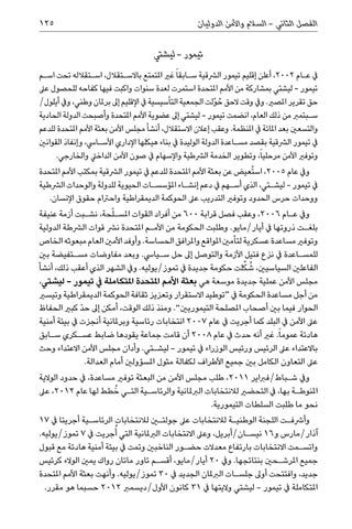 تيمور -ليشتي يف ع�ام ،2002أعلن إقليم تيمور الرشقية س�ابقا ً غري املتمتع باالس�تقالل ،اس�تقالله تحت اس�م تيمور -ليشتي بمشاركة من األمم املتحدة استمرت لعدة سنوات واكبت فيها كفاحه للحصول عىل حق تقرير املصري .ويف وقت الحق ُح ِّولت الجمعية التأسيسية يف اإلقليم إىل برملان وطني ،ويف أيلول/ س�بتمرب من ذلك العام ،انضمت تيمور -ليشتي إىل عضوية األمم املتحدة وأصبحت الدولة الحادية والتسعني بعد املائة يف املنظمة .وعقب إعالن االستقالل ،أنشأ مجلس األمن بعثة األمم املتحدة للدعم يف تيمور الرشقية بقصد مس�اعدة الدولة الوليدة يف بناء هيكلها اإلداري األس�ايس ،وإنفاذ القوانني وتوفري األمن مرحلياً ،وتطوير الخدمة الرشطية واإلسهام يف صون األمن الداخيل والخارجي. ويف عام ،2005اس ُتعيض عن بعثة األمم املتحدة للدعم يف تيمور الرشقية بمكتب األمم املتحدة يف تيمور -ليش�تي ،الذي أس�هم يف دعم إنش�اء املؤسس�ات الحيوية للدولة والوحدات الرشطية ووحدات حرس الحدود وتوفري التدريب عىل الحوكمة الديمقراطية واحرتام حقوق اإلنسان. ويف ع�ام ،2006وعقب فصل قرابة 600من أفراد القوات املس�لّحة ،نش�بت أزمة عنيفة بلغ�ت ذروتها يف أيار/مايو .وطلبت الحكومة من األم�م املتحدة نرش قوات الرشطة الدولية وتوفري مساعدة عسكرية لتأمني املواقع واملرافق الحساسة .وأوفد األمني العام مبعوثه الخاص للمس�اعدة يف نزع فتيل األزمة والتوصل إىل حل س�يايس .وبعد مفاوضات مس�تفيضة بني الفاعلني السياسينيُ ،ش ِّكلت حكومة جديدة يف تموز/يوليه .ويف الشهر الذي أعقب ذلك ،أنشأ مجلس األمن عملية جديدة موسعة هي بعثة األمم املتحدة املتكاملة يف تيمور -ليشتي، من أجل مساعدة الحكومة يف “توطيد االستقرار وتعزيز ثقافة الحوكمة الديمقراطية وتيسري الحوار فيما بني أصحاب املصلحة التيموريني” .ومنذ ذلك الوقت ،أمكن إىل ح ّد كبري الحفاظ عىل األمن يف البلد كما أجريت يف عام 2007انتخابات رئاسية وبرملانية أنجزت يف بيئة أمنية هادئة عموماً .غري أنه حدث يف عام 2008أن قامت جماعة يقودها ضابط عس�كري س�ابق باالعتداء عىل الرئيس ورئيس الوزراء يف تيمور -ليش�تي .وأدان مجلس األمن االعتداء وحث عىل التعاون الكامل بني جميع األطراف لكفالة مثول املسؤولني أمام العدالة. ويف ش�باط/فرباير ،2011طلب مجلس األمن من البعثة توفري مساعدة ،يف حدود الوالية املنوط�ة بها ،يف التحضري لالنتخابات الربملانية والرئاس�ية الت�ي ُخطط لها عام ،2012عىل نحو ما طلبت السلطات التيمورية. وأرشف�ت اللجنة الوطني�ة لالنتخابات عىل جولتين لالنتخابات الرئاس�ية أجريتا يف 17 آذار/مارس و 16نيس�ان/أبريل ،وعىل االنتخابات الربملانية التي أُجريت يف 7تموز/يوليه. واتس�مت االنتخابات بارتفاع معدالت حض�ور الناخبني وتمت يف بيئة أمنية هادئة مع قبول جميع املرش�حني بنتائجها .ويف 20أيار/مايو ،أقس�م تاور ماتان رواك يمني الوالء كرئيس جديد ،وافتتحت أوىل جلس�ات الربملان الجديد يف 30تموز/يوليه .وأنهت بعثة األمم املتحدة املتكاملة يف تيمور -ليشتي واليتها يف 31كانون األول/ديسمرب 2012حسبما هو مقرر.