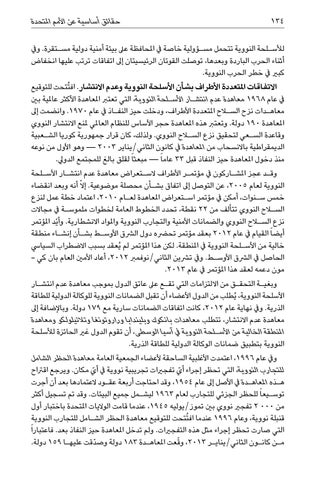 لألس�لحة النووية تتحمل مس�ؤولية خاصة يف املحافظة عىل بيئة أمنية دولية مس�تقرة .ويف أثناء الحرب الباردة وبعدها ،توصلت القوتان الرئيسيتان إىل اتفاقات ترتب عليها انخفاض كبري يف خطر الحرب النووية. االتفاقات املتعددة األطراف بشأن األسلحة النووية وعدم االنتشار .اف ُتتحت للتوقيع يف عام 1968معاهدة عدم انتش�ار األس�لحة النووية ،التي تعترب املعاهدة األكثر عاملية بني معاه�دات نزح السلاح املتعددة األطراف ،ودخلت حيز النف�اذ يف عام .1970وانضمت إىل املعاهدة 190دولة .وتعترب هذه املعاهدة حجر األساس للنظام العاملي ملنع االنتشار النووي وقاعدة الس�عي لتحقيق نزع السلاح النووي .ولذلك ،كان قرار جمهورية كوريا الش�عبية الديمقراطية باالنسحاب من املعاهدة يف كانون الثاني/يناير — 2003وهو األول من نوعه منذ دخول املعاهدة حيز النفاذ قبل 33عاما ً — مبعثا ً لقلق بالغ للمجتمع الدويل. وق�د عجز املش�اركون يف مؤتم�ر األطراف الس�تعراض معاهدة عدم انتش�ار األس�لحة النووية لعام ،2005عن التوصل إىل اتفاق بش�أن محصلة موضوعية .إالّ أنه وبعد انقضاء خمس س�نوات ،أمكن يف مؤتمر اس�تعراض املعاهدة لع�ام ،2010اعتماد خطة عمل لنزع السلاح النووي تتألف من 22نقطة ،تحدد الخطوط العامة لخطوات ملموس�ة يف مجاالت نزع السلاح النووي والضمانات األمنية والتجارب النووية واملواد االنشطارية .وأ ّيد املؤتمر أيضا ً القيام يف عام 2012بعقد مؤتمر تحرضه دول الرشق األوس�ط بش�أن إنش�اء منطقة خالية من األس�لحة النووية يف املنطقة .لكن هذا املؤتمر لم ُيعقد بسبب االضطراب السيايس الحاصل يف الرشق األوس�ط .ويف ترشين الثاني/نوفمرب ،2012أعاد األمني العام بان كي - مون دعمه لعقد هذا املؤتمر يف عام .2013 وبغي�ة التحق�ق من االلتزامات التي تق�ع عىل عاتق الدول بموجب معاهدة عدم انتش�ار األسلحة النوويةُ ،يطلب من الدول األعضاء أن تقبل الضمانات النووية للوكالة الدولية للطاقة الذرية .ويف نهاية عام ،2012كانت اتفاقات الضمانات سارية مع 179دولة .وباإلضافة إىل معاهدة عدم االنتشار ،تتطلب معاهدات بانكوك وبليندابا وراروتونغا وتالتيلولكو ومعاهدة املنطقة الخالية من األس�لحة النووية يف آسيا الوسطى ،أن تقوم الدول غري الحائزة لألسلحة النووية بتطبيق ضمانات الوكالة الدولية للطاقة الذرية. ويف عام ،1996اعتمدت األغلبية الساحقة ألعضاء الجمعية العامة معاهدة الحظر الشامل أي مكان .ويرجع اقرتاح أي تفجريات تجريبية نووية يف ّ للتجارب النووية ،التي تحظر إجراء ّ ه�ذه املعاه�دة يف األصل إىل عام ،1954وقد احتاجت أربعة عق�ود العتمادها بعد أن أجرت توس�يعا ً للحظر الجزئي للتجارب لعام 1963ليش�مل جميع البيئات .وقد تم تسجيل أكثر من 2 000تفجري نووي بني تموز/يوليه ،1945عندما قامت الواليات املتحدة باختبار أول قنبلة نووية ،وعام 1996عندما اف ُتتحت للتوقيع معاهدة الحظر الش�امل للتجارب النووية التي صارت تحظر إجراء مثل هذه التفجريات .ولم تدخل املعاهدة حيز النفاذ بعد .فاعتبارا ً م�ن كان�ون الثاني/يناي�ر ،2013و ّقعت املعاه�دة 183دولة وصدّقت عليه�ا 159دولة.