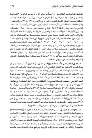 وتدخ�ل املعاهدة حيز النفاذ بعد 180يوما ً من قيام 44دولة مدرجة يف املرفق 2للمعاهدة بالتصدي�ق عليه�ا .وال�دول املدرج�ة يف ‘املرفق ’2هي ال�دول التي ش�اركت يف املفاوضات املتعلقة بمعاهدة الحظر الشامل للتجارب النووية بني األعوام 1994و ،1996وكانت تحوز وقتها مفاعالت للطاقة النووية أو مفاعالت للبحوث .ويف كانون الثاني/يناير ،2013كانت ثمان�ي دول مدرج�ة يف املرفق 2ال تزال خ�ارج املعاهدة وهي :إرسائيل وإيران وباكس�تان وجمهورية كوريا الش�عبية الديمقراطية والصني ومرص والهند والواليات املتحدة األمريكية. وقام األمني العام لألمم املتحدة بصفته وديع املعاهدة بعقد سلس�لة من االجتماعات بغرض تس�يري دخول معاهدة الحظر الش�امل للتجارب النووية حيز النفاذ ،وذلك يف األعوام 1999 و 2001و 2003و 2005و 2007و 2009و .2011ويف آخ�ر ه�ذه االجتماع�ات اعتمدت ال�دول باإلجماع اإلعالن الختامي الذي يحدد عرشة تدابري عملية لدخول املعاهدة حيز النفاذ وتحقيق عامليتها يف أقرب وقت ممكن .ويستمر العمل يف األمانة التقنية املؤقتة املنشأة يف عام 1997لضمان وجود نظام دويل للرصد يف حيز التشغيل عندما يأزف وقت رسيان املعاهدة. وعند اكتمال نظام الرصد سيتألف من 337مرفقا ً للرصد ُتستكمل بنظام للتفتيش التدخيل يف املواقع يبدأ تطبيقه فور رسيان املعاهدة. املناط�ق الخالية من األس�لحة النووية .يف تط�ور مهَّد الطريق أم�ام تحرك جديد يف مجال تحديد األس�لحة عىل النطاق اإلقليمي ،أدى توقيع معاهدة حظر األس�لحة النووية يف أمري�كا الالتينية ومنطق�ة البحر الكاريبي (معاه�دة تالتيلولكو) إىل إنش�اء منطقة خالية م�ن األس�لحة النووية يف منطقة مأهولة م�ن العالم ألول مرة .وبإي�داع وثائق تصديق كوبا يف ع�ام ،2002تدعم�ت املنطقة الخالية من األس�لحة النووية يف أمري�كا الالتينية ومنطقة البحر الكاريبي وأصبحت ش�املة لجميع دول املنطقة .ويف وقت الحق أُنش�ئت أربع مناطق أخ�رى — يف جن�وب املحي�ط اله�ادئ (معاهدة راروتونغ�ا ،)1985 ،وجنوب رشق آس�يا (معاهدة بانكوك ،)1995 ،وأفريقيا (معاهدة بليندابا ،)1996 ،وآس�يا الوس�طى (معاهدة املنطقة الخالية من األس�لحة النووية يف آس�يا الوس�طى .)2006 ،و ُقدمت مقرتحات إلنشاء مناطق خالية من األس�لحة النووية يف وس�ط أوروبا وجنوب آس�يا إضافة إىل منطقة خالية من األس�لحة النووية وأسلحة الدمار الش�امل يف الرشق األوسط .وأق ّر املجتمع الدويل يف عام ،1998مفهوم تحول بلد بمفرده إىل منطقة خالية من األسلحة النووية عندما أيدت الجمعية العامة اإلعالن الذاتي ملنغوليا بمركزها كبلد خا ٍل من األسلحة النووية. من�ع االنتش�ار النووي .تعم�ل الوكال�ة الدولية للطاق�ة الذري�ة ()www.iaea.org بوصفه�ا هيئ�ة التفتيش وجهة املش�ورة وامليسرّ على الصعيد العاملي لتطبي�ق الضمانات النووي�ة وتدابير التحقق املتصل�ة بالربامج النووية الس�لمية .وبموجب اتفاق�ات ُتربم مع الدولُ ،يجري مفتش�و الوكالة زيارات دورية للمنشآت النووية للتحقق من سجالت األماكن الت�ي ُيحتفظ فيها باملواد النووية ،والتفتي�ش عىل أدوات ومعدات املراقبة التي تقوم الوكالة برتكيبه�ا ،والتث ُّبت من املوج�ودات من املواد النووية .وبوضع ه�ذه الضمانات وغريها معاً،