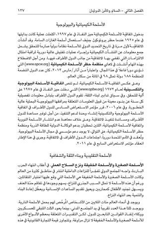 األسلحة الكيميائية والبيولوجية بدخول اتفاقية األس�لحة الكيميائية حيز النف�اذ يف عام ،1997اكتملت عملية كانت بدايتها يف عام 1925عندما حظر بروتوكول جنيف اس�تعمال أسلحة الغازات السامة .وقد أنشأت االتفاقي�ة ألول م�رة يف تاريخ التحديد الدويل لألس�لحة نظاما ً دوليا ً صارما ً للتحقق يش�مل جمع معلومات عن املنش�آت الكيميائية وإج�راء عمليات تفتيش عاملية دورية ملراقبة امتثال االلتزام�ات التي تقيض به�ا االتفاقية من جانب الدول األطراف فيه�ا .ومن أجل االضطالع بهذه املهام أُنش�ئت يف الهاي منظمة حظر األس�لحة الكيميائية ( )www.opcw.orgالتي ت�ؤدي دورا ً فاعالً يف هذا املجال .واعتبارا ً م�ن آذار/مارس ،2013كان عدد الدول املنضمة للمنظمة 188دولة تمثل 98يف املائة من سكان العالم. وعلى عك�س اتفاقي�ة األس�لحة الكيميائية ،ل�م تنص اتفاقي�ة األس�لحة البيولوجية والتكس�ينية لع�ام )www.opbw.org( 1972الت�ي دخلت حيز النف�اذ يف عام 1975عىل آلية للتحقق .ويف س�ياق تدابري لبناء الثقة ،تقوم الدول األطراف بتبادل معلومات تفصيلية كل س�نة عن بن�ود معينة من قبيل املعلوم�ات املتعلقة بمرافقها البيولوجي�ة البحثية عالية الخط�ورة .ويف عام ،2006قرر مؤتمر االس�تعراض الس�ادس للدول األط�راف يف اتفاقية األس�لحة البيولوجية والتكسينية إنش�اء وحدة لدعم التنفيذ ،من أجل توفري مساعدة للدول األط�راف ومس�اندة تنفي�ذ االتفاقية .وعلى خالف معاهدة عدم انتش�ار األس�لحة النووية واتفاقية األس�لحة الكيميائية ،اللتني تحظيان بدعم الوكال�ة الدولية للطاقة الذرية ومنظمة حظر األس�لحة الكيميائية ،عىل التوايل ،ال يوجد دعم مؤسسي يف مجال األسلحة البيولوجية. و ُتعق�د يف األمم املتحدة دورياً ،اجتماعات ال�دول األطراف يف االتفاقية ،وجرى يف هذا اإلطار انعقاد مؤتمر االستعراض السابع يف عام .2011