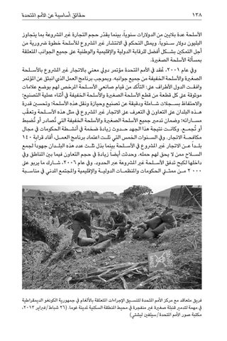 األسلحة عدة باليني من الدوالرات سنوياً ،بينما يقدّر حجم التجارة غري املرشوعة بما يتجاوز البليون دوالر س�نوياً .ويمثل التحكم يف االنتشار غري املرشوع لألسلحة خطوة رضورية من أجل التمكني بش�كل أفضل للرقابة الدولية واإلقليمية والوطنية عىل جميع الجوانب املتعلقة بمسألة األسلحة الصغرية. ويف عام ،2001عُقد يف األمم املتحدة مؤتمر دويل معني باالتجار غري املرشوع باألس�لحة الصغرية واألسلحة الخفيفة من جميع جوانبه .وبموجب برنامج العمل الذي انبثق عن املؤتمر وافق�ت الدول األطراف عىل :التأكد من قيام صانعي األس�لحة املرخص لهم بوضع عالمات موثوقة عىل كل قطعة من قطع األسلحة الصغرية واألسلحة الخفيفة يف أثناء عملية التصنيع؛ واالحتفاظ بس�جالت ش�املة ودقيقة عن تصنيع وحيازة ونقل هذه األسلحة؛ وتحسني قدرة ه�ذه البلدان عىل التعاون يف التعرف عىل االتجار غري املرشوع يف مثل هذه األس�لحة وتع ّقب مس�اراته؛ وضمان تدمري جميع األسلحة الصغرية واألسلحة الخفيفة التي ُتصادر أو ُتضبط أو ُتجم�ع .وكان�ت نتيجة هذا الجهد ح�دوث زيادة ضخمة يف أنش�طة الحكومات يف مجال مكافح�ة االتجار .ويف الس�نوات الخمس التي تل�ت اعتماد برنامج العم�ل ،أفاد قرابة 140 بل�دا ً ع�ن االتجار غري املرشوع يف األس�لحة بينما بذل ثل�ث عدد هذه البل�دان جهودا ً لجمع السلاح ممن ال يحق لهم حمله .وحدثت أيضا ً زيادة يف حجم التعاون فيما بني املناطق ويف داخلها لكبح تدفق األس�لحة غري املرشوعة عرب الحدود .ويف عام ،2006ش�ارك ما يربو عىل 2 000م�ن ممثلي الحكومات واملنظم�ات الدولي�ة واإلقليمية واملجتمع املدني يف مناس�بة