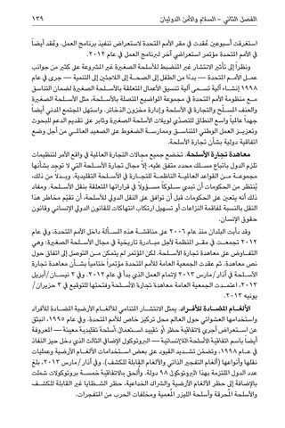 استغرقت أسبوعني عُقدت يف مقر األمم املتحدة الستعراض تنفيذ برنامج العمل .وعُقد أيضا ً يف األمم املتحدة مؤتمر استعرايض آخر لربنامج العمل يف عام .2012 ونظرا ً إىل تأثري االنتشار غري املنضبط لألسلحة الصغرية غري املرشوعة عىل كثري من جوانب عم�ل األم�م املتحدة — بدءًا من الطفل إىل الصح�ة إىل الالجئني إىل التنمية — جرى يف عام 1998إنش�اء آلية تس�مى آلية تنسيق األعمال املتعلقة باألس�لحة الصغرية لضمان التناسق م�ع منظومة األمم املتحدة يف مجموعة املواضيع املتصلة باألس�لحة ،مثل األس�لحة الصغرية والعنف املس�لّح والتجارة يف األسلحة وإدارة مخزون الذخائر .واستهل املجتمع املدني أيضا ً جهدا ً عامليا ً واسع النطاق للتصدّي لويالت األسلحة الصغرية وثابر عىل تقديم الدعم للبحوث وتعزي�ز العمل الوطني املتناس�ق وممارس�ة الضغوط عىل الصعيد العامل�ي من أجل وضع اتفاقية دولية بشأن تجارة األسلحة. معاهدة تجارة األسلحة .تخضع جميع مجاالت التجارة العاملية يف واقع األمر لتنظيمات تلزم الدول باتباع مس�لك محدد متفق عليه ،إالّ مجال تجارة األس�لحة التي ال توجد بشأنها مجموع�ة م�ن القواعد العاملي�ة الناظم�ة للتج�ارة يف األس�لحة التقليدية .وب�دال ً من ذلك، ُينتظر من الحكومات أن تبدي س�لوكا ً مس�ؤوال ً يف قراراتها املتعلقة بنقل األس�لحة .ومفاد ذلك أنه يتعني عىل الحكومات قبل أن توافق عىل النقل الدويل لألسلحة ،أن تقيّم مخاطر هذا النقل بالنسبة ملفاقمة النزاعات أو تسهيل ارتكاب انتهاكات للقانون الدويل اإلنساني وقانون حقوق اإلنسان. وقد دأبت البلدان منذ عام 2006عىل مناقش�ة هذه املس�ألة داخل األمم املتحدة ،ويف عام 2012تجمع�ت يف مق�ر املنظمة ألجل مب�ادرة تاريخية يف مجال األس�لحة الصغرية :وهي التف�اوض عىل معاهدة تجارة األس�لحة .لكن املؤتمر لم يتمكن م�ن التوصل إىل اتفاق حول نص معاهدة .ثم عقدت الجمعية العامة لألمم املتحدة مؤتمرا ً ختاميا ً بش�أن معاهدة تجارة األس�لحة يف آذار/مارس 2013إلتمام العمل الذي بدأ يف عام .2012ويف 2نيس�ان/أبريل ،2013اعتم�دت الجمعية العامة معاهدة تجارة األس�لحة وفتحتها للتوقيع يف 3حزيران/ يونيه .2013 األلغ�ام املض�ادة لألف�راد .يمثل االنتش�ار املتنامي لأللغ�ام األرضية املض�ادة لألفراد واستخدامها العشوائي حول العالم محل تركيز خاص لألمم املتحدة .ويف عام ،1995انبثق عن اس�تعراض أجري التفاقية حظر أو تقييد اس�تعمال أسلحة تقليدية معينة — املعروفة أيضا ً باسم اتفاقية األسلحة الالإنسانية — الربوتوكول اإلضايف الثالث الذي دخل حيز النفاذ يف ع�ام ،1998وتض ّمن تش�ديد القيود عىل بعض اس�تخدامات األلغ�ام األرضية وعمليات نقلها وأنواعها (ألغام التفجري الذاتي واأللغام القابلة للكشف) .ويف آذار/مارس ،2013بلغ عدد الدول امللتزمة بهذا الربوتوكول 98دولة .وأُلحق باالتفاقية خمس�ة بروتوكوالت شملت باإلضافة إىل حظر األلغام األرضية والرشاك الخداعية ،حظر الش�ظايا غري القابلة للكش�ف واألسلحة املُحرقة وأسلحة الليزر املُعمية ومخلفات الحرب من املتفجرات.