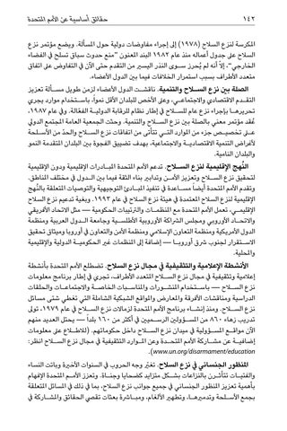املكرسة لنزع السالح ( )1978إىل إجراء مفاوضات دولية حول املسألة .ويضع مؤتمر نزع السالح عىل جدول أعماله منذ عام 1982البند املعنون “منع حدوث سباق تسلح يف الفضاء الخارجي” ،إالّ أنه لم ُيحرز س�وى النذر اليسري من التقدم حتى اآلن يف التفاوض عىل اتفاق متعدد األطراف بسبب استمرار الخالفات فيما بني الدول األعضاء. الصلة بني نزع السلاح والتنمية .ناقش�ت الدول األعضاء لزمن طويل مس�ألة تعزيز التق�دم االقتصادي واالجتماع�ي ،وعىل األخص للبلدان األقل نمواً ،باس�تخدام موارد يجري تحريره�ا بإجراء نزع عام للسلاح يف إطار نظام للرقابة الدولي�ة الف ّعالة .ويف عام ،1987 عُقد مؤتمر معني بالصلة بني نزع السلاح والتنمية .وحثت الجمعية العامة املجتمع الدويل على تخصي�ص جزء من املوارد الت�ي تتأتى من اتفاقات نزع السلاح والح ّد من األس�لحة ألغراض التنمية االقتصادي�ة واالجتماعية ،بهدف تضييق الفجوة بني البلدان املتقدمة النمو والبلدان النامية. ُ النهج اإلقليمية لنزع السلاح .تدعم األمم املتحدة املب�ادرات اإلقليمية ودون اإلقليمية لتحقيق نزع السلاح وتعزيز األم�ن وتدابري بناء الثقة فيما بني ال�دول يف مختلف املناطق. وتقدم األمم املتحدة أيضا ً مس�اعدة يف تنفيذ املب�ادئ التوجيهية والتوصيات املتعلقة بال ُنهج اإلقليمية لنزع السالح املعتمدة يف هيئة نزع السالح يف عام .1993وبغية تدعيم نزع السالح اإلقليم�ي ،تعمل األمم املتحدة مع املنظم�ات والرتتيبات الحكومية — مثل االتحاد األفريقي واالتح�اد األوروبي ومجلس الرشاكة األوروبية األطلس�ية وجامعة ال�دول العربية ومنظمة الدول األمريكية ومنظمة التعاون اإلسالمي ومنظمة األمن والتعاون يف أوروبا وميثاق تحقيق االس�تقرار لجنوب رشق أوروب�ا — إضافة إىل املنظمات غري الحكومي�ة الدولية واإلقليمية واملحلية. األنشطة اإلعالمية والتثقيفية يف مجال نزع السالح .تضطلع األمم املتحدة بأنشطة إعالمية وتثقيفية يف مجال نزع السلاح املتعدد األطراف ،تجري يف إطار برنامج معلومات نزع السلاح — باس�تخدام املنش�ورات واملناس�بات الخاص�ة واالجتماع�ات والحلقات الدراسية ومناقشات األفرقة واملعارض واملواقع الشبكية الشاملة التي تغطي شتى مسائل نزع السلاح .ومنذ إنش�اء برنامج األمم املتحدة لزماالت نزع السلاح يف عام ،1979توىل تدريب زهاء 860من املس�ؤولني الرس�ميني يف أكثر من 160بلدا ً — يحتل العديد منهم اآلن مواق�ع املس�ؤولية يف ميدان نزع السلاح داخل حكوماتهم( .لالطلاع عىل معلومات إضافي�ة عن مش�اركة األمم املتح�دة وعن امل�وارد التثقيفية يف مجال نزع السلاح انظر: .)www.un.org/disarmament/education املنظور الجنساني يف نزع السالح .تغيرّ وجه الحروب يف السنوات األخرية وباتت النساء والفتي�ات تتأث�رن بالنزاعات بش�كل متزايد كضحايا وجن�اة .وتعزز األم�م املتحدة اإلفهام بأهمية تعزيز املنظور الجنساني يف جميع جوانب نزع السالح ،بما يف ذلك يف املسائل املتعلقة بجمع األس�لحة وتدمريه�ا ،وتطهري األلغام ،ومب�ارشة بعثات تقيص الحقائق واملش�اركة يف