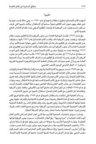ناميبيا أسهمت األمم املتحدة يف تحقيق استقالل ناميبيا يف عام — 1990وهي حالة قدمت نموذجا ً ملدى تعقد جهود تحول أحد األقاليم تحوال ً س�لميا ً إىل االستقالل .وكانت ناميبيا التي عُرفت من قبل باس�م جنوب غرب أفريقي�ا قد ُوضعت كإقليم أفريقي تحت نظ�ام االنتداب التابع لعصبة األمم. ويف ع�ام ،1946طلب�ت الجمعية العامة م�ن جنوب أفريقي�ا إدارة اإلقليم بموجب نظام الوصاية .ورفضت جنوب أفريقيا ذلك ،وأفادت األمم املتحدة يف عام 1949بأنها س�تتوقف ع�ن تقديم معلومات عن اإلقليم متذرعة بأن نظام االنتداب انتهى بنهاية عصبة األمم .ورأت الجمعي�ة العام�ة أن جنوب أفريقيا لم ت�ف بالتزاماتها ،وألغت انتدابها على اإلقليم يف عام 1966ووضعته تحت مس�ؤولية مجل�س األمم املتحدة لجنوب غ�رب أفريقيا ،الذي أعيدت تس�ميته يف ع�ام 1968إىل مجل�س ناميبيا .ويف عام ،1976طل�ب مجلس األمن من جنوب أفريقي�ا أن تقب�ل بإج�راء انتخابات يف اإلقليم تح�ت إرشاف األمم املتح�دة .ورأت الجمعية العامة رضورة أن تضم محادثات االس�تقالل املنظمة الش�عبية ألفريقي�ا الجنوبية الغربية (سوابو) — املمثل الرشعي الوحيد للشعب الناميبي. ويف عام ،1978قدمت جمهورية أملانيا االتحادية وفرنسا وكندا واململكة املتحدة والواليات املتحدة إىل مجلس األمن اقرتاحا ً للتسوية ينص عىل إجراء انتخابات لجمعية تأسيسية تحت رعاية األمم املتحدة .وأيد مجلس األمن توصيات األمني العام بتنفيذ االقرتاح وطلب إليه تعيني ممثل خاص لناميبيا ،وإنش�اء فريق األمم املتحدة للمس�اعدة يف فرتة االنتقال .وبعد سنوات م�ن املفاوضات من جانب األمني العام وممثله الخاص ،وبوس�اطة الواليات املتحدة ،أُبرمت يف ع�ام 1988اتفاقات من أجل إحالل السلام يف الجن�وب األفريقي ،وافقت جنوب أفريقيا بمقتضاها عىل التعاون مع األمني العام لضمان استقالل ناميبيا عن طريق االنتخابات. وب�دأت العملية التي اخ ُتتمت باس�تقالل ناميبيا يف ع�ام .1989وقام خاللها فريق األمم املتحدة للمس�اعدة يف فرتة االنتقال بضبط مجمل العملي�ة االنتخابية واإلرشاف عليها ،وهي عملية تولتها السلطات الناميبية .وتوىل الفريق رصد وقف إطالق النار بني املنظمة الشعبية ألفريقي�ا الجنوبية الغربية (س�وابو) وجن�وب أفريقيا ،وترسيح جميع القوات العس�كرية، وضمن إجراء عملية انتخابية سلسة شملت رصد مراكز الرشطة املحلية. وف�ازت س�وابو بانتخابات الجمعية التأسيس�ية الت�ي اعترب املمثل الخ�اص لألمني العام أنه�ا كانت انتخاب�ات “حرة ونزيهة” .ويف أعقاب االنتخابات ،س�حبت جنوب أفريقيا قواتها املتبقي�ة .وتول�ت الجمعية التأسيس�ية صياغة دس�تور جديد ووفق عليه يف ش�باط/فرباير ،1990وانتخبت الجمعية التأسيس�ية س�ام نجوما زعيم سوابو رئيس�ا ً ملدة خمس سنوات. ويف آذار/مارس ،أصبحت ناميبيا دولة مستقلة وتوىل األمني العام إجراءات حلف اليمني ألول رئيس ناميبي .ويف نيسان/أبريل من السنة نفسها انضمت ناميبيا إىل عضوية األمم املتحدة.