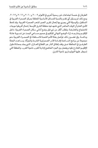 الطرفان يف خمسة اجتماعات غري رسمية أخرى يف األعوام 2009و 2010و 2011و.2012 أي تقدم بالنسبة للمسائل األساسية املتعلقة بمركز الصحراء الغربية يف ومع ذلك ،لم يسجل ّ َّ املستقبل ،والوسيلة التي يجري بها إعمال تقرير املصري لشعب الصحراء الغربية .وقد الحظ األمني العام أن الوقت الحارض الذي تشهد فيه منطقة الرشق األوسط/شمال أفريقيا موجات لالحتجاج واملعارضة ،يتطلب أكثر من ذي قبل وضع أماني سكان الصحراء الغربية ،داخل اإلقلي�م وخارج�ه ،إزاء الوضع النهائي لإلقليم يف صميم مس�اعي البحث عن تس�وية عادلة ودائم�ة .ويف غض�ون ذلك ،تواصل بعثة األمم املتحدة لالس�تفتاء يف الصح�راء الغربية دعم مجموعة من برامج املس�اعدة إلف�ادة األرس الصحراوية املرشدة واملج ّزأة .وس�اعدت البعثة الطرفين يف املحافظة على وقف إطالق النار عرب القطاع الع�ازل ،الذي يمتد بمحاذاة طول اإلقلي�م املتنازع عليه ويفصل بني الجزء الخاضع إلدارة املغرب ناحية الغرب ،واملنطقة التي تسيطر عليها البوليساريو ناحية الرشق.