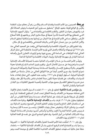 يربط العديدون بني األمم املتحدة وقضايا السلام واألم�ن رغم أن معظم موارد املنظمة يك ّرس يف الواقع للوفاء بتعهد امليثاق “بتحقيق مس�توى أعىل للمعيش�ة وتوفري العمالة لكل فرد والنهوض بعوام�ل التطور والتقدم االقتصادي واالجتماع�ي” .وتؤثر الجهود اإلنمائية الت�ي تضطلع بها األمم املتحدة تأثيرا ً عميقا ً يف حياة ماليني البرش ورفاههم يف كافة أصقاع األرض .وتنطلق مساعي األمم املتحدة يف هذا املجال من إيمانها بعدم إمكانية تحقيق السالم واألمن الدائمني من دون ضمان تم ُّتع الناس بالرفاه االجتماعي واالقتصادي يف كل مكان. وقد انطبع كثري من التحوالت االقتصادية واالجتماعية التي وقعت عىل الصعيد العاملي منذ عام 1945يف توجهاته وأشكاله بالعمل الذي تؤديه األمم املتحدة .فاملنظمة التي تمثل املركز العاملي لبناء التوافقات هي الساحة التي يجري فيها وضع أولويات التعاون الدويل وأهدافه ملساعدة البلدان يف جهودها اإلنمائية وإيجاد البيئات االقتصادية العاملية الداعمة. وتو ّف�ر األمم املتح�دة من خلال املؤتم�رات العاملية منص�ة لصياغة األه�داف اإلنمائية الجدي�دة وتعزيزها عىل ج�دول األعمال الدويل .وتقوم بتبيني الحاج�ة إلدراج قضايا معينة كالنهوض باملرأة وحقوق اإلنس�ان والتنمية املس�تدامة وحماية البيئة والحوكمة الرشيدة يف نموذج التنمية .وقد جرى التعبري أيضا ً عن هذا التوافق العاملي من خالل سلسلة من العقود اإلنمائية الدولية ،اس� ُتهل أولها يف عام .1961وتشدد هذه العقود ،التي تمثل إعالنات عامة للسياسات واألهداف ،عىل قضايا معينة تكون محالً الهتمام خاص بالنسبة لكل عقد ،وتؤكد على رضورة تحقيق التقدم يف جميع جوانب التنمية وأهمي�ة تضييق التفاوتات بني البلدان الصناعية والبلدان النامية. ويف مؤتم�ر قم�ة األلفية املعقود يف عام ،2000اعتمدت ال�دول األعضاء إعالن األلفية، الذي ض ّمنته مجموعة من األهداف واسعة النطاق تحدد املسار املستقبيل للمنظمة .ثم ُترجم اإلعالن إىل خريطة طريق اش�تملت عىل ثمانية أهداف مح�ددة زمنيا ً قابلة للقياس من أجل تحقيقها بحلول عام ،2015عُرفت باس�م األهداف اإلنمائية لأللفية .وغاية هذه األهداف هي اس�تئصال الفقر املدقع والجوع؛ وتوفري التعليم االبتدائي للجميع؛ وتعزيز املساواة بني الجنسين وتمكني املرأة؛ وتخفيض معدّل وفيات األطفال؛ وتحسين صح�ة األم؛ ومحاربة فيروس نقص املناعة البرشية/اإليدز واملالريا وأمراض أخرى؛ وضمان االس�تدامة البيئية؛ وبناء الرشاكات العاملية من أجل التنمية .وقد قطع املجتمع الدويل عىل نفسه يف القمة العاملية لعام 2005االلتزام بهذه األهداف. ويف عام ،2010اخ ُتتمت قمة األمم املتحدة املعنية باألهداف اإلنمائية لأللفية — املعروفة رس�ميا ً باس�م االجتماع العام الرفيع املستوى بش�أن األهداف اإلنمائية لأللفية — باعتماد خطة عمل عاملية تس�تهدف تحقيق األهداف الثماني�ة ملكافحة الفقر يف موعدها املحدد وهو 159