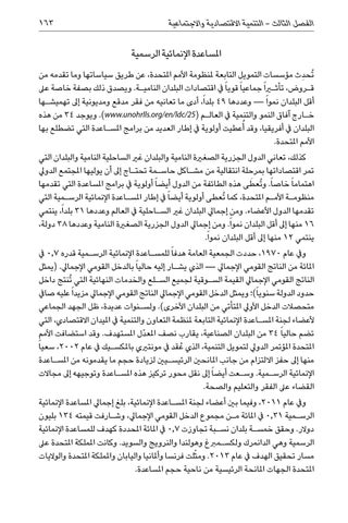 املساعدة اإلنمائية الرسمية ُتحدِث مؤسسات التمويل التابعة ملنظومة األمم املتحدة ،عن طريق سياساتها وما تقدمه من ق�روض ،تأثيرا ً جماعيا ً قويا ً يف اقتصادات البلدان النامي�ة .ويصدق ذلك بصفة خاصة عىل أقل البلدان نموا ً — وعددها 49بلداً ،أدى ما تعانيه من فقر مدقع ومديونية إىل تهميش�ها خ�ارج آفاق النمو والتنمية يف العال�م ( .)www.unohrlls.org/en/ldc/25ويوجد 34من هذه البلدان يف أفريقيا ،وقد أُعطيت أولوية يف إطار العديد من برامج املس�اعدة التي تضطلع بها األمم املتحدة. كذلك ،تعاني الدول الجزرية الصغرية النامية والبلدان غري الساحلية النامية والبلدان التي تمر اقتصاداتها بمرحلة انتقالية من مش�اكل حاس�مة تحت�اج إىل أن يوليها املجتمع الدويل اهتماما ً خاصاً .و ُت َ عطى هذه الطائفة من الدول أيضا ً أولوية يف برامج املساعدة التي تقدمها منظوم�ة األم�م املتحدة ،كما ُتعطى أولوية أيضا ً يف إطار املس�اعدة اإلنمائية الرس�مية التي تقدمها الدول األعضاء .ومن إجمايل البلدان غري الس�احلية يف العالم وعددها 31بلداً ،ينتمي 16منها إىل أقل البلدان نمواً .ومن إجمايل الدول الجزرية الصغرية النامية وعددها 38دولة، ينتمي 12منها إىل أقل البلدان نمواً. ويف عام ،1970حددت الجمعية العامة هدفا ً للمس�اعدة اإلنمائية الرس�مية قدره 0,7يف املائة من الناتج القومي اإلجمايل — الذي يش�ار إليه حاليا ً بالدخل القومي اإلجمايل( .يمثل الناتج القومي اإلجمايل القيمة الس�وقية لجميع الس�لع والخدمات النهائية التي ُتنتج داخل حدود الدولة سنوياً)؛ ويمثل الدخل القومي اإلجمايل الناتج القومي اإلجمايل مزيدا ً عليه صايف متحصالت الدخل األويل املتأتي من البلدان األخرى) .ولس�نوات عديدة ،ظل الجهد الجماعي ألعضاء لجنة املس�اعدة اإلنمائية التابعة ملنظمة التعاون والتنمية يف امليدان االقتصادي ،التي تضم حاليا ً 34من البلدان الصناعية ،يقارب نصف املعدّل املستهدف .وقد استضافت األمم املتحدة املؤتمر الدويل لتمويل التنمية ،الذي عُقد يف مونتريي باملكس�يك يف عام ،2002سعيا ً منها إىل حفز االلتزام من جانب املانحني الرئيس�يني لزيادة حجم ما يقدمونه من املس�اعدة اإلنمائية الرس�مية .وس�عت أيضا ً إىل نقل محور تركيز هذه املس�اعدة وتوجيهه إىل مجاالت القضاء عىل الفقر والتعليم والصحة. ويف عام ،2011وفيما بني أعضاء لجنة املس�اعدة اإلنمائية ،بلغ إجمايل املساعدة اإلنمائية الرس�مية 0,31يف املائة م�ن مجموع الدخل القومي اإلجمايل ،وش�ارفت قيمته 134بليون دوالر .وحقق خمس�ة بلدان نس�بة تجاوزت 0,7يف املائة املحددة كهدف للمساعدة اإلنمائية الرسمية وهي الدانمرك ولكس�مربغ وهولندا والنرويج والسويد .وكانت اململكة املتحدة عىل مسار تحقيق الهدف يف عام .2013ومثّلت فرنسا وأملانيا واليابان واململكة املتحدة والواليات املتحدة الجهات املانحة الرئيسية من ناحية حجم املساعدة.