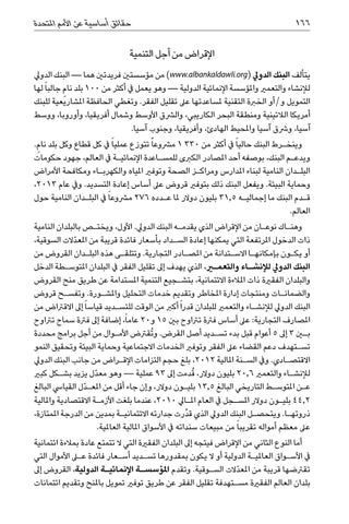 اإلقراض من أجل التنمية يتألف البنك الدويل ( )www.albankaldawli.orgمن مؤسستني فريدتني هما — البنك الدويل نام جالبا ً لها لإلنشاء والتعمري واملؤسسة اإلنمائية الدولية — وهو يعمل يف أكثر من 100بلد ٍ التمويل و/أو الخربة التقنية ملساعدتها عىل تقليل الفقر .وتغطي الحافظة املشاريعية للبنك أمريكا الالتينية ومنطقة البحر الكاريبي ،والرشق األوسط وشمال أفريقيا ،وأوروبا ،ووسط آسيا ،ورشق آسيا واملحيط الهادئ ،وأفريقيا ،وجنوب آسيا. ً ً ً نام. وينخ�رط البنك حاليا يف أكثر من 1 330مرشوعا تتوزع عمليا يف كل قطاع وكل بلد ٍ ويدع�م البنك ،بوصفه أحد املصادر الكربى للمس�اعدة اإلنمائي�ة يف العالم ،جهود حكومات البل�دان النامية لبناء املدارس ومراك�ز الصحة وتوفري املياه والكهرب�اء ومكافحة األمراض وحماية البيئة .ويفعل البنك ذلك بتوفري قروض عىل أساس إعادة التسديد .ويف عام ،2013 ق�دم البنك ما إجمالي�ه 31,5بليون دوالر ملا ع�دده 276مرشوعا ً يف البل�دان النامية حول العالم. وهن�اك نوع�ان من اإلقراض الذي يقدم�ه البنك الدويل .األول ،ويخت�ص بالبلدان النامية ذات الدخول املرتفعة التي يمكنها إعادة الس�داد بأسعار فائدة قريبة من املعدّالت السوقية، أو يك�ون بإمكانه�ا االس�تدانة من املص�ادر التجارية .وتتلق�ى هذه البل�دان القروض من البنك الدويل لإلنش�اء والتعمير ،الذي يهدف إىل تقليل الفقر يف البلدان املتوس�طة الدخل والبلدان الفقرية ذات املالءة االئتمانية ،بتش�جيع التنمية املستدامة عن طريق منح القروض والضمان�ات ومنتجات إدارة املخاطر وتقديم خدمات التحليل واملش�ورة .وتفس�ح قروض البنك الدويل لإلنش�اء والتعمري للبلدان قدرا ً أكرب من الوقت للتس�ديد قياسا ً إىل االقرتاض من املصارف التجارية :عىل أساس فرتة ترتاوح بني 15و 20عاماً ،إضافة إىل فرتة سماح ترتاوح بين 3إىل 5أعوام قبل بدء تس�ديد أصل القرض .و ُتقرتض األم�وال من أجل برامج محددة تس�تهدف دعم القضاء عىل الفقر وتوفري الخدمات االجتماعية وحماية البيئة وتحقيق النمو االقتص�ادي .ويف الس�نة املالية ،2012بلغ حجم التزامات اإلق�راض من جانب البنك الدويل لإلنش�اء والتعمري 20,6بليون دوالرُ ،قدمت إىل 93عملية — وهو معدّل يزيد بش�كل كبري ع�ن املتوس�ط التاريخي البالغ 13,5بلي�ون دوالر ،وإن جاء أقل من املع�دّل القيايس البالغ 44,2بلي�ون دوالر املس�جل يف العام امل�ايل ،2010عندما بلغت األزم�ة االقتصادية واملالية ذروته�ا .ويتحص�ل البنك الدويل الذي قدِّرت جدارته االئتماني�ة بمدين من الدرجة املمتازة، عىل معظم أمواله تقريبا ً من مبيعات سنداته يف األسواق املالية العاملية. أما النوع الثاني من اإلقراض فيتجه إىل البلدان الفقرية التي ال تتمتع عادة بمالءة ائتمانية يف األس�واق العاملي�ة الدولية أو ال يكون بمقدورها تس�ديد أس�عار فائدة على األموال التي تقرتضها قريبة من املعدّالت الس�وقية .وتقدم املؤسس�ة اإلنمائي�ة الدولية ،القروض إىل بلدان العالم الفقرية مس�تهدفة تقليل الفقر عن طريق توفري تمويل باملنح وتقديم ائتمانات