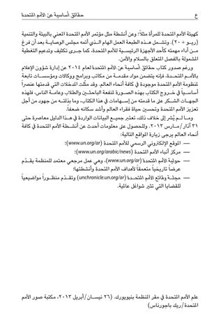 كهيئة األمم املتحدة للمرأة مثالً؛ وعن أنشطة مثل مؤتمر األمم املتحدة املعني بالبيئة والتنمية (ري�و .)20 +وتش�مل ه�ذه الطبعة العمل الهام ال�ذي أتمه مجلس الوصاي�ة بعد أن فرغ م�ن أداء مهمته كأحد األجهزة الرئيس�ية لألمم املتحدة ،كما ج�رى تكثيف وتدعيم التغطية املشمولة بالفصل املتعلق بالسالم واألمن. ورغم صدور كتاب حقائق أساسية عن األمم املتحدة لعام 2014عن إدارة شؤون اإلعالم باألم�م املتح�دة ،فإنه يتضمن مواد مقدم�ة من مكاتب وبرامج ووكاالت ومؤسس�ات تابعة ملنظومة األمم املتحدة موجودة يف كافة أنحاء العالم .وقد مثّلت املدخالت التي قدمتها عنرصا ً أساس�يا ً يف خ�روج الكتاب بهذه الص�ورة ملنفعة الباحثين والطالب وعام�ة الناس ،فلهذه الجه�ات الش�كر عىل ما قدمته من إس�هامات يف هذا الكتاب ،وما بذلت�ه من جهود من أجل تعزيز األمم املتحدة وتحسني حياة فقراء العالم وأشد سكانه ضعفاً. وم�ا ل�م ُيرش إىل خالف ذلك ،تعترب جمي�ع البيانات الواردة يف ه�ذا الدليل معارصة حتى 31آذار/م�ارس .2013وللحصول عىل معلومات أحدث عن أنش�طة األمم املتحدة يف كافة أنحاء العالم يرجى زيارة املواقع التالية: — املوقع اإللكرتوني الرسمي لألمم املتحدة ()www.un.org/ar؛ — مركز أنباء األمم املتحدة ()www.un.org/arabic/news؛ — حولية األمم املتحدة ( ،)www.un.org/arوهي عمل مرجعي معتمد للمنظمة يقـدّم عرضا ً تاريخيا ً متعمقا ً ألهداف األمم املتحدة وأنشطتها؛ — مجل�ة وقائع األمم املتح�دة ( )unchronicle.un.org/arوتقـدّم منظـورا ً مواضيعيا ً للقضايا التي تثري شواغل عاملية.