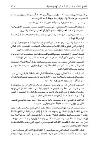 يف كان�ون الثاني/يناي�ر .2010ويف نيس�ان/أبريل ،2013أدخ�ل الصن�دوق مزي�دا ً من التحسينات عىل هذه األدوات بغية زيادة مرونة الدعم الذي يقدمه. وتتضمن تسهيالت التمويل الرئيسية لصندوق النقد الدويل ما ييل: • •ترتيبات االس�تعداد االس�تئماني ،وهي مصممة لتقديم مساعدة متوسطة األجل ملوازين املدفوعات يف حاالت العجز املؤقت قصري األجل أو العجز ذي الطابع الدوري؛ • •خ�ط االئتمان املرن ،وه�و مصمم للتعامل مع جمي�ع االحتياجات املحتمل�ة أو الفعلية ملوازين املدفوعات؛ • •خط التحوط والسيولة ،وهو مصمم لتلبية االحتيـاجات الالزمة ملنع حدوث األزمة وحلها يف البلدان التي تتمتع بركائز اقتصادية سليمة وأ ُ ُطر للسياسات املؤسسية ،لكنها تعاني من أوجه ضعف متبقية تحول دون استفادتها من استخدام خط االئتمان املرن؛ • •تسهيل الصندوق املمتد ،وهو مصمم لتقديم املساعدة ملواجهة مصاعب موازين املدفوعات ذات الطابع طويل األجل أو الناجم عن مشاكل االقتصاد الكيل واملشاكل الهيكلية؛ ً أجلا للبلدان املنخفضة • •التس�هيل االئتماني املمتد ،وهو مصمم لتقديم مس�اعدة أطول الدخل التي تعاني مش�اكل عميقة ذات طابع هي�كيل يف موازين املدفوعات لتمكينها من مواصلة سياساتها لتقليل الفقر؛ • •تسهيل االستعداد االئتماني ،ويو ّفر دعما ً مرنا ً للبلدان املنخفضة الدخل التي تكون لديها احتياج�ات تمويلي�ة وإصالحية قصرية األجل ناجمة عن تعرضه�ا لصدمات داخلية أو خارجية أو بسبب وجود قصور يف السياسات؛ • •التس�هيل االئتماني الرسيع ،وهو مرفق تس�هييل يقدم الدعم املايل الرسيع بمرشوطيات محدودة يف ش�كل دفعة واحدة تؤدى عند التوقيع للبل�دان منخفضة الدخل التي تواجه احتياجات عاجلة ملوازين املدفوعات ناجمة عن صدمات مثل الكوارث الطبيعية أو التغيرّ يف أسعار السلع األساسية أو األزمات الحاصلة يف بلدان مجاورة؛ • •آلية التمويل الرسيع ،وتو ّفر مس�اعدة مالية رسيعة بمرشوطية محدودة لجميع األعضاء الذين يواجهون احتياجات عاجلة تتعلق بموازين املدفوعات. وبغية تخفيف الديون عىل الدول الفقرية املثقلة بالديون التي تتبع سياسات سليمة ،يقوم صندوق النقد الدويل والبنك الدويل بصورة مشتركة ،يف إطار مبادرة البلدان الفقرية املثقلة بالديون بتقديم مساعدة استثنائية للبلدان املؤهلة من أجل تخفيض أعباء ديونها الخارجية إىل مستويات محتملة .ويضم صندوق النقد الدويل والبنك الدويل يف الوقت الحارض جهودهما م�ن أجل دعم املبادرة املتعددة األطراف لتخفيف ع�بء الديون التي ُوضعت لتكملة مبادرة البلدان الفقرية املثقلة بالديون. وتمث�ل املتابع�ات العملية التي يجريه�ا صندوق النقد الدويل اآللية التي يس�تعني بها يف تقييم سياسات األعضاء املتعلقة بأسعار رصف العمالت ،وتتضمن املتابعات إجراء تحليالت