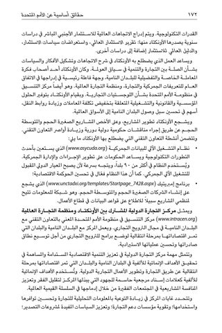 القدرات التكنولوجية .ويتم إدراج االتجاهات العاملية لالس�تثمار األجنبي املبارش يف دراسات سنوية يصدرها األونكتاد منها :تقرير االستثمار العاملي ،واستعراضات سياسات االستثمار، والدليل العاملي لالستثمار إضافة إىل دراسات أخرى. ويساعد العمل الذي يضطلع به األونكتاد يف رشح االتجاهات وتشكيل األفكار والسياسات بش�أن الصل�ة بني التجارة والتنمية يف س�ياق العومل�ة .وكان األونكتاد أح�د أصحاب فكرة املعامل�ة الخاص�ة والتفضيلية للبل�دان النامية ،وجهة فاعلة رئيس�ية يف إدراجها يف االتفاق الع�ام للتعريفات الجمركية والتجارة ،ومنظمة التجارة العاملية .وهو أيضا ً مركز التنس�يق يف منظوم�ة األمم املتحدة بش�أن اللوجس�تيات التجاري�ة .وبقيام األونكت�اد بتوفري الحلول املؤسس�ية والقانونية والتش�غيلية املتعلقة بتخفيض تكلفة املعامالت وزيادة روابط النقل، أسهم يف تحسني سبل وصول البلدان النامية إىل األسواق العاملية. ويش�جع األونكتاد تطوير املشاريع ،وعىل األخص املش�اريع الصغرية الحجم واملتوسطة الحج�م عن طريق إجراء مناقش�ات حكومية دولية دورية وزي�ادة أوارص التعاون التقني. وتتضمن أنشطة التعاون التقني التي يضطلع بها األونكتاد ما ييل: • •نظ�ام التش�غيل اآليل للبيانات الجمركي�ة ( )www.asycuda.orgالذي يس�تعني بأحدث التطورات التكنولوجية ويس�اعد الحكومات عىل تطوير اإلج�راءات واإلدارة الجمركية. و ُيس�تخدم النظام يف أكثر من 90بلداً ،ويتج�ه برسعة ألن يصبح املعيار الدويل املقبول للتشغيل اآليل الجمركي .كما أن هذا النظام ف ّعال يف تحسني الحوكمة االقتصادية؛ • •برنامج إمربيتيك ( )www.unctadxi.org/templates/Startpage_7428.aspxالذي يشجع عىل إنش�اء الرشكات الصغرية الحجم واملتوس�طة الحجم .وهو ش�بكة للمعلومات تتيح ملنظمي املشاريع سبيالً لالطالع عىل قواعد البيانات يف قطاع األعمال. ويمث�ل مرك�ز التجارة الدولية املشترك بني األونكت�اد ومنظمة التج�ارة العاملية ( )www.intracen.orgمركز التنس�يق يف منظومة األمم املتح�دة املعني بالتعاون التقني مع البل�دان النامي�ة يف مجال الرتويج التجاري .ويعمل املركز مع البل�دان النامية والبلدان التي تم�ر اقتصاداته�ا بمرحلة انتقالية لوض�ع برامج للرتويج التجاري من أجل توس�يع نطاق صادراتها وتحسني عملياتها االستريادية. وتتمثل مهمة مركز التجارة الدولية يف تعزيز التنمية االقتصادية املس�تدامة واملساهمة يف تحقي�ق األهداف اإلنمائية لأللفية يف البلدان النامية والبل�دان التي تمر اقتصاداتها بمرحلة انتقالية عن طريق التجارة وتطوير األعمال التجارية الدولية .و ُتس�تخدم األهداف اإلنمائية لأللفية كعالمات إس�ناد مرجعية حاس�مة للجهود التي يبذلها املرك�ز لتقليل الفقر وتعزيز املنافسة املشاريعية يف املجتمعات الفقرية من خالل إدماجها يف السلسلة القيمية العاملية. وتتح�دد غايات املركز يف زي�ادة التوعية باملعلومات التحليلية للتجارة وتحسين توافرها واستخدامها؛ وتقوية مؤسسات دعم التجارة؛ وتعزيز السياسات املفيدة ملرشوعات التصدير؛