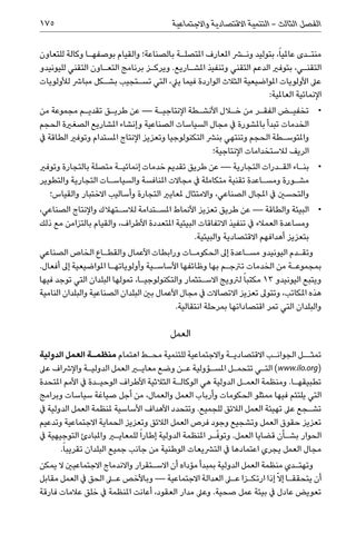 العمل تمثـ�ل الجوان�ب االقتصادي�ة واالجتماعية للتنمية مح�ط اهتمام منظم�ة العمل الدولية ( )www.ilo.orgالت�ي تتحم�ل املس�ؤولية ع�ن وضع معايير العمل الدولي�ة واإلرشاف عىل تطبيقه�ا .ومنظمة العم�ل الدولية هي الوكال�ة الثالثية األطراف الوحي�دة يف األمم املتحدة التي يلتئم فيها ممثلو الحكومات وأرباب العمل والعمال ،من أجل صياغة سياسات وبرامج تش�جع عىل تهيئة العمل الالئق للجميع .وتتحدد األهداف األساسية ملنظمة العمل الدولية يف تعزيز حقوق العمل وتشجيع وجود فرص العمل الالئق وتعزيز الحماية االجتماعية وتدعيم الحوار بش�أن قضايا العمل .وتو ّف�ر املنظمة الدولية إطارا ً للمعايير واملبادئ التوجيهية يف مجال العمل يجري اعتمادها يف الترشيعات الوطنية من جانب جميع البلدان تقريباً. وتهت�دي منظمة العمل الدولية بمبدأ مؤداه أن االس�تقرار واالندماج االجتماعيني ال يمكن أن يتحقق�ا إالّ إذا ارتك�زا على العدالة االجتماعية — وباألخص على الحق يف العمل مقابل تعويض عادل يف بيئة عمل صحية .وعىل مدار العقود ،أعانت املنظمة يف خلق عالمات فارقة