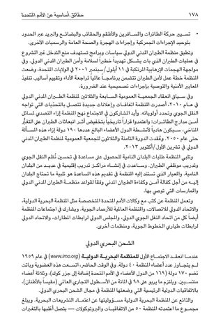 • •تس�يري حركة الطائرات واملس�افرين واألطقم والحقائب والبضائ�ع والربيد عرب الحدود بتوحيد اإلجراءات الجمركية وإجراءات الهجرة والصحة العامة والرسميات األخرى. وتطبق منظمة الطريان املدني الدويل سياسات وبرامج تستهدف منع التدخل غري املرشوع يف عمليات الطريان الذي بات يش�كل تهديدا ً خطريا ً لسالمة وأمن الطريان املدني الدويل .ويف مواجهة الهجمات اإلرهابية املرتكبة يف 11أيلول/سبتمرب 2001يف الواليات املتحدة ،وضعت املنظمة خطة عمل ألمن الطريان تتضمن برنامجـا ً عامليا ً ملراجعة األداء وتقييم أساليب تنفيذ املعايري األمنية والتوصية بإجراءات تصحيحية عند الرضورة. ويف س�ياق انعقاد الجمعي�ة العمومية الس�ابعة والثالثني ملنظمة الطيران املدني الدويل يف ع�ام ،2010أصدرت املنظمة اتفاق�ات وإعالنات جديدة تتص�ل بالتحدّيات التي تواجه النقل الجوي وتحدد أولوياته .وأيد املشاركون يف االجتماع نهج املنظمة إزاء التصدي ملسائل أم�ن مدارج الطائ�رات؛ واعتمدوا قرارا ً تاريخيا ً بتخفيض أث�ر انبعاثات الطريان عىل التغيرُّ املناخي ،س�يكون هاديا ً ألنش�طة الدول األعضاء البالغ عددها 190دولة إزاء هذه املس�ألة حتى عام .2050وعُقدت الدورة الثامنة والثالثون للجمعية العمومية ملنظمة الطريان املدني الدويل يف ترشين األول/أكتوبر .2013 وتلبي املنظمة طلبات البلدان النامية للحصول عىل مساعدة يف تحسني ُنظم النقل الجوي وتدريب موظفي الطريان .وس�اعدت يف إنش�اء مراك�ز تدريب إقليمية يف عدي�د من البلدان النامية .واملعيار الذي تستند إليه املنظمة يف تقديم هذه املساعدة هو تلبية ما تحتاج البلدان إلي�ه من أجل كفالة أم�ن وكفاءة الطريان املدني وفقا ً لقواعد منظم�ة الطريان املدني الدويل واملمارسات التي تويص بها. وتعمل املنظمة عن كثب مع وكاالت األمم املتحدة املتخصصة مثل املنظمة البحرية الدولية، واالتحاد الدويل لالتصاالت ،واملنظمة العاملية لألرصاد الجوية .ويشارك يف اجتماعات املنظمة أيضا ً كل من اتحاد النقل الجوي الدويل ،واملجلس الدويل لرابطات املطارات ،واالتحاد الدويل لرابطات طياري الخطوط الجوية ،ومنظمات أخرى.
