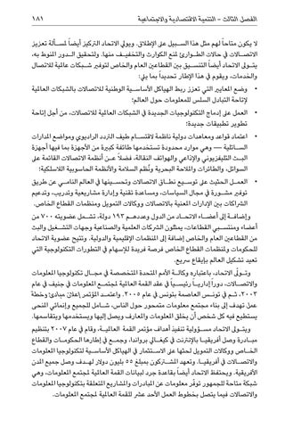 ال يكون متاحا ً لهم مثل هذا الس�بيل عىل اإلطالق .ويويل االتحاد الرتكيز أيضا ً ملس�ألة تعزيز االتص�االت يف حاالت الط�وارئ ملنع الكوارث والتخفي�ف منها .ولتحقيق ال�دور املنوط به، يت�وىل االتحاد أيضا ً التنس�يق بني القطاعني العام والخاص لتوفري ش�بكات عاملية لالتصال والخدمات ،ويقوم يف هذا اإلطار تحديدا ً بما ييل: • •وضع املعايري التي تعزز ربط الهياكل األساس�ية الوطنية لالتصاالت بالشبكات العاملية إلتاحة التبادل السلس للمعلومات حول العالم؛ • •العمل عىل إدماج التكنولوجيات الجديدة يف الشبكات العاملية لالتصاالت ،من أجل إتاحة تطوير تطبيقات جديدة؛ • •اعتماد قواعد ومعاهدات دولية ناظمة القتس�ام طيف الرتدد الراديوي ومواضع املدارات الس�اتلية — وهي موارد محدودة تستخدمها طائفة كبرية من األجهزة بما فيها أجهزة الب�ث التليفزيوني واإلذاعي والهواتف النقالة ،فضالً ع�ن أنظمة االتصاالت القائمة عىل السواتل ،والطائرات واملالحة البحرية و ُنظم السالمة واألنظمة الحاسوبية الالسلكية؛ • •العم�ل الحثيث عىل توس�يع نط�اق االتصاالت وتحس�ينها يف العالم النام�ي عن طريق توفري مش�ورة يف مجال السياسات ،ومساعدة تقنية وإدارة مشاريعية وتدريب ،وتدعيم الرشاكات بني اإلدارات املعنية باالتصاالت ووكاالت التمويل ومنظمات القطاع الخاص. وإضاف�ة إىل أعض�اء االتح�اد من الدول وعدده�م 193دولة ،تش�مل عضويته 700من أعضاء ومنتس�بي القطاعات ،يمثلون الرشكات العلمية والصناعية وجهات التش�غيل والبث من القطاعني العام والخاص إضافة إىل املنظمات اإلقليمية والدولية .وتتيح عضوية االتحاد للحكومات وملنظمات القطاع الخاص فرصة فريدة لإلسهام يف التطورات التكنولوجية التي تعيد تشكيل العالم بإيقاع رسيع. وت�ولىّ االتحاد ،باعتباره وكال�ة األمم املتحدة املتخصصة يف مج�ال تكنولوجيا املعلومات واالتص�االت ،دورا ً إداري�ا ً رئيس�يا ً يف عقد القمة العاملية ملجتم�ع املعلومات يف جنيف يف عام ،2003ث�م يف تون�س العاصمة بتونس يف عام .2005واعتم�د املؤتمر إعالن مبادئ وخطة عمل تهدف إىل بناء مجتمع معلومات متمحور حول الناس ،ش�امل للجميع وإنمائي املنحى يستطيع فيه كل شخص أن يخلق املعلومات واملعارف ويصل إليها ويستخدمها ويتقاسمها. ويت�وىل االتحاد مس�ؤولية تنفيذ أهداف مؤتمر القمة العاملي�ة ،وقام يف عام 2007بتنظيم مب�ادرة وصل أفريقي�ا باإلنرتنت يف كيغ�ايل برواندا ،وجم�ع يف إطارها الحكوم�ات والقطاع الخ�اص ووكاالت التمويل لحثها عىل االس�تثمار يف الهياكل األساس�ية لتكنولوجيا املعلومات واالتص�االت يف أفريقي�ا .وتعهد املشتركون بمبلغ 55بليون دوالر له�دف وصل جميع املدن األفريقية .ويحتفظ االتحاد أيضا ً بقاعدة جرد لبيانات القمة العاملية ملجتمع املعلومات ،وهي شبكة متاحة للجمهور تو ّفر معلومات عن املبادرات واملشاريع املتعلقة بتكنولوجيا املعلومات واالتصاالت فيما يتصل بخطوط العمل األحد عرش للقمة العاملية ملجتمع املعلومات.