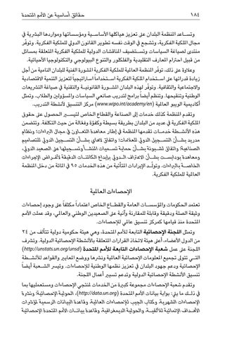 وتس�اعد املنظمة البلدان عىل تعزيز هياكلها األساس�ية ومؤسساتها ومواردها البرشية يف مجال امللكية الفكرية ،وتشجع يف الوقت نفسه تطوير القانون الدويل للملكية الفكرية .وتو ّفر منتدى لصياغة السياسات وتس�تضيف املناقشات الدولية للملكية الفكرية املتعلقة بمسائل من قبيل احرتام املعارف التقليدية والفلكلور والتنوع البيولوجي والتكنولوجيا األحيائية. وعالوة عىل ذلك ،تو ّفر املنظمة العاملية للملكية الفكرية املشورة الفنية للبلدان النامية من أجل زيادة قدراتها عىل اس�تخدام امللكية الفكرية اس�تخداما ً اسرتاتيجيا ً لتعزيز التنمية االقتصادية واالجتماعية والثقافية .وتو ّفر لهذه البلدان املش�ورة القانوني�ة والتقنية يف صياغة الترشيعات الوطنية وتنقيحها .وتنظم أيضا ً برامج لتدريب صانعي السياسات واملسؤولني والطالب .وتمثل أكاديمية الويبو العاملية ( )www.wipo.int/academy/enمركز التنسيق ألنشطة التدريب. وتقدم املنظمة كذلك خدمات إىل الصناعة والقطاع الخاص لتيسير الحصول عىل حقوق امللكية الفكرية يف عديد من البلدان بطريقة بسيطة وكفؤة وف ّعالة من حيث التكلفة .وتتضمن هذه األنش�طة خدم�ات تقدمها املنظمة يف إطار معاهدة التع�اون يف مجال الرباءات؛ ونظام مدريد بش�أن التس�جيل الدويل للعالمات؛ واتفاق الهاي بش�أن التس�جيل الدويل للتصاميم الصناعية؛ واتفاق لش�بونة بش�أن حماية تس�ميات املنش�أ وتس�جيلها عىل الصعيد الدويل، ومعاهدة بودابس�ت بش�أن االعرتاف ال�دويل بإيداع الكائن�ات الدقيقة ألغ�راض اإلجراءات الخاص�ة بالرباءات .وتولّ�د اإليرادات املتأتية من هذه الخدمات 95يف املائة من دخل املنظمة العاملية للملكية الفكرية.