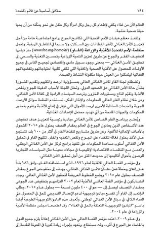 العالم اآلن من غذاء يكفي إلطعام كل رجل وكل امرأة وكل طفل عىل نحو ّ يمكنه من أن يحيا حياة صحية منتجة. وتنف�ذ معظم هيئ�ات األمم املتحدة التي تكاف�ح الجوع برامج اجتماعي�ة هامة من أجل تعزي�ز األمن الغذائي ألفقر القطاعات بني الس�كان ،وال س�يما يف املناط�ق الريفية .وتعمل منظمة األمم املتحدة لألغذية والزراعة (الف�او) ( )www.fao.org/home/arمنذ قيامها لتخفي�ف الفق�ر والجوع عن طريق تعزيز التنمية الزراعية وتحسين التغذية والس�عي إىل تحقي�ق األم�ن الغذائي — بمعنى وجود س�بيل مادي واقتصادي لجمي�ع الناس يف جميع األوق�ات للحصول عىل األغذية الصحية واملغذية التي تكفي لتلبية احتياجاتهم وتفضيالتهم الغذائية ليتمكنوا من العيش حياة مكفولة النشاط والصحة. وتضطلع لجنة الفاو لألمن الغذائي العاملي بمس�ؤولية الرصد والتقييم وتقديم املش�ورة بشأن حالة األمن الغذائي عىل الصعيد الدويل .وتحلل اللجنة األسباب الدفينة للجوع ونقص األغذية وتقيّم املتاح ومستويات املخزون وترصد السياسات الرامية إىل كفالة األمن الغذائي. ومن خالل نظام الفاو العاملي للمعلومات واإلنذار املبكر ،تس�تخدم املنظمة سواتل األرصاد الجوية والخدمات الساتلية األخرى لرصد األحوال التي تؤثر يف إنتاج األغذية وتقوم بتحذير أي تهديد محتمل لإلمدادات الغذائية. الحكومات والجهات املانحة من ّ و ُيعتبر برنام�ج الفاو الخ�اص لألمن الغذائي مبادرة رئيس�ية لتعزي�ز هدف تخفيض عدد األش�خاص الذين يعانون الجوع يف العالم بمقدار النصف بحلول عام 2015املشمول تش�جع باألهداف اإلنمائية لأللفية .وعن طريق مش�اريع تنفذها الفاو يف أكثر من 100بلد، ّ على األخذ بحلول ف ّعالة للقضاء عىل الج�وع ونقص التغذية والفقر .تنتهج الفاو يف تحقيق األمن الغذائي أسلوب مساعدة الحكومات عىل تنفيذ برامج تركز عىل األمن الغذائي الوطني، والعم�ل م�ع املنظم�ات االقتصادية اإلقليمي�ة يف مجاالت معين�ة مثل السياس�ات التجارية للوصول بأحوال أقاليمها إىل حدودها املثىل من أجل تحقيق األمن الغذائي. ويف مؤتم�ر القم�ة العاملي لألغذية لعام ،1996الذي اس�تضافته الف�او ،وافق 186بلدا ً على إعالن وخطة عمل بش�أن األم�ن الغذائي العامل�ي ،يهدف إىل تخفي�ض الجوع بمقدار النص�ف بحلول عام 2015ويضع الخطوط العريضة لتحقيق األمن الغذائي العاملي .وجدد املش�اركون يف مؤتمر القمة العامل�ي لألغذية لعام 2002التزامه�م بتخفيض عدد الجوعى بمق�دار النص�ف ليص�ل إىل — حوايل 400مليون نس�مة — بحلول ع�ام .2015وطلب املؤتم�ر إىل الفاو أن تض�ع مبادئ توجيهية لدعم اإلعم�ال التدريجي للحق يف الحصول عىل الغذاء الكايف ،يف سياق األمن الغذائي الوطني .و ُتعرف هذه املبادئ التوجيهية الطوعية أيضا ً باس�م “املبادئ التوجيهي�ة املتعلقة بالحق يف الغذاء” ،وقد اعتمده�ا مجلس منظمة األغذية والزراعة يف عام .2004 ويف ع�ام ،2009اعتمد مؤتمر القم�ة العاملي حول األمن الغذائي إعالنا ً يلزم جميع الدول بالقضاء عىل الجوع يف أقرب وقت مستطاع .وتعهد بإجراء زيادة كبرية يف املعونة املقدمة إىل
