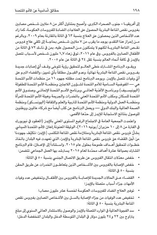 إىل أفريقي�ا -جنوب الصحراء الكربى .وأصبح بمتناول أكثر من 8ماليني ش�خص مصابني بفريوس نقص املناعة البرشية الحصول عىل العالجات املضادة للفريوسات العكوسة ،كما زاد عدد األشخاص الذين يحصلون عىل العالج بنسبة 63يف املائة باملقارنة بعام .2009وبالرغم م�ن إحراز هذا التقدم ،يوجد ما يقرب من 7ماليني ش�خص بحاج�ة إىل تلقي عالج فريوس نق�ص املناعة البرشي�ة لكنهم ال يتمكنون م�ن الحصول عليه ،بمن يف ذل�ك 72يف املائة من األطفال املصابني بالفريوس .ويف عام ،2011تويف زهاء 1,7مليون ش�خص ألس�باب تتصل باإليدز يف كافة أنحاء العالم بنسبة تقل 24يف املائة عن عام .2005 أي إصابات جديدة ويق�ود الربنامج املشترك خطى العال�م لتحقيق رؤية تتوخى وق�ف ّ بأي تمييز ،والقضاء املربم عىل بفيروس نقص املناعة البرشية نهائياً ،وعدم القب�ول مطلقا ً ّ أي وفيات تتصل باإليدز .ويوحد الربنامج تحت مظلته جهود 11من منظمات األمم املتحدة ّ هي — املفوضية الس�امية لألمم املتحدة لش�ؤون الالجئني ومنظم�ة األمم املتحدة للطفولة (اليونيس�يف) وبرنام�ج األغذية العامل�ي وبرنامج األم�م املتحدة اإلنمائ�ي وصندوق األمم املتحدة للسكان ومكتب األمم املتحدة املعني باملخدرات والجريمة وهيئة األمم املتحدة للمرأة ومنظم�ة العمل الدولية ومنظمة األمم املتحدة للرتبية والعلم والثقافة (اليونس�كو) ومنظمة الصحة العاملية والبنك الدويل — ويعمل الربنامج عن كثب أيضا ً مع رشكاء عامليني ووطنيني للوصول بنتائج االستجابة لإليدز إىل حدّها األقىص. واعتمدت الجمعية العامة يف االجتماع الرفيع املستوى املعني باإليدز (املعقود يف نيويورك يف الفرتة من 8إىل 10حزيران/يونيه ،)2011الوثيقة املعنونة إعالن األمم املتحدة السيايس بشأن فريوس نقص املناعة البرشية ومتالزمة نقص املناعة املكتسب/اإليدز :تكثيف جهودنا من أجل القضاء عىل فريوس نقص املناعة البرشية واإليدز ،الذي تعهدت فيه البلدان باتخاذ خط�وات لتحقيق أه�داف طموحة بحلول عام .2015واس�تنادا ً إىل اإلعلان ،قام الربنامج املشرتك بصياغة عرشة أهداف محدّدة لعام 2015يسرتشد بها العمل الجماعي تتضمن: • •خفض معدّالت انتقال الفريوس عن طريق االتصال الجنيس بنسبة 50يف املائة؛ • •خفض اإلصابة بالفريوس بني األش�خاص الذين يتعاط�ون املخدرات عن طريق الحقن بنسبة 50يف املائة؛ • •القض�اء على الحاالت الجديدة لإلصاب�ة بالفريوس بني األطف�ال وتخفيض عدد وفيات األمهات ج ّراء أسباب متصلة باإليدز؛ • •توفري العالج املضاد للفريوسات العكوسة لخمسة عرش مليون مصاب؛ • •تخفيض عدد الوفيات من ج ّراء اإلصابة بالس�ل بني األشخاص املصابني بفريوس نقص املناعة البرشية بنسبة 50يف املائة؛ • •سد الفجوة العاملية يف املوارد املتصلة باإليدز والوصول باالستثمار العاملي السنوي إىل مبلغ يرتاوح بني 22و 24بليون دوالر يف البلدان املتوسطة الدخل والبلدان املنخفضة الدخل؛
