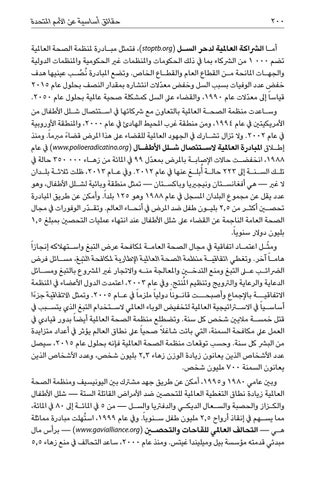 أم�ا الرشاكة العاملية لدحر الس�ل ( ،)stoptb.orgفتمثل مب�ادرة ملنظمة الصحة العاملية تضم 1 000من الرشكاء بما يف ذلك الحكومات واملنظمات غري الحكومية واملنظمات الدولية ص�ب عينيها هدف والجه�ات املانحة م�ن القطاع العام والقط�اع الخاص .وتضع املبادرة ُن ُ خفض عدد الوفيات بسبب السل وخفض معدّالت انتشاره بمقدار النصف بحلول عام 2015 قياسا ً إىل معدّالت عام ،1990والقضاء عىل السل كمشكلة صحية عاملية بحلول عام .2050 وس�اعدت منظمة الصح�ة العاملية بالتعاون مع رشكائها يف اس�تئصال ش�لل األطفال من األمريكيتني يف عام ،1994ومن منطقة غرب املحيط الهادئ يف عام ،2000واملنطقة األوروبية يف عام .2002وال تزال تش�ارك يف الجهود العاملية للقضاء عىل هذا املرض قضا ًء مربماً .ومنذ إطلاق املبادرة العاملية الس�تئصال ش�لل األطف�ال ( )www.polioeradicatino.orgيف عام ،1988انخفض�ت حاالت اإلصاب�ة باملرض بمعدّل 99يف املائة من زه�اء 350 000حالة يف تل�ك الس�نـة إىل 223حالـة أُبلـغ عنها يف عام .2012ويف ع�ام ،2013ظلت ثالثـة بلـدان ال غري — هي أفغانس�تان ونيجرييا وباكس�تان — تمثل منطقة وبائية لش�لل األطفال ،وهو عدد يقل عن مجموع البلدان املسجل يف عام 1988وهو 125بلداً .وأمكن عن طريق املبادرة تحصين أكث�ر من 2,5بلي�ون طفل ضد املرض يف أنح�اء العالم .وتق�دّر الوفورات يف مجال الصحة العامة الناجمة عن القضاء عىل شلل األطفال عند انتهاء عمليات التحصني بمبلغ 1,5 بليون دوالر سنوياً. ومثّ�ل اعتم�اد اتفاقية يف مجال الصحة العام�ة ملكافحة عرض التبغ واس�تهالكه إنجازا ً هام�ا ً آخر .وتغطي اتفاقي�ة منظمة الصحة العاملية اإلطارية ملكافحة التبغ ،مس�ائل فرض الرضائ�ب على التبغ ومنع التدخين واملعالجة من�ه واالتجار غري املرشوع بالتبغ ومس�ائل الدعاية والرعاية والرتويج وتنظيم املُنتج .ويف عام ،2003اعتمدت الدول األعضاء يف املنظمة االتفاقيـ�ة باإلجماع وأصبحـ�ت قانـونا ً دوليا ً ملزما ً يف ع�ام .2005وتمثل االتفاقية جزءًا أساس�يا ً يف االستراتيجية العاملية لتخفيض الوباء العاملي الس�تخدام التبغ الذي يتس�بب يف قتل خمس�ة ماليني شخص كل سنة .وتضطلع منظمة الصحة العاملية أيضا ً بدور قيادي يف العمل عىل مكافحة السمنة ،التي باتت شاغالً صحيا ً عىل نطاق العالم يؤثر يف أعداد متزايدة من البرش كل سنة .وحسب توقعات منظمة الصحة العاملية فإنه بحلول عام ،2015سيصل عدد األشخاص الذين يعانون زيادة الوزن زهاء 2,3بليون شخص ،وعدد األشخاص الذين يعانون السمنة 700مليون شخص. وبني عامي 1980و ،1995أمكن عن طريق جهد مشرتك بني اليونيسيف ومنظمة الصحة العاملية زيادة نطاق التغطية العاملية للتحصني ضد األمراض القاتلة الستة — شلل األطفال والك�زاز والحصبة والس�عال الديك�ي والدفرتيا والس�ل — من 5يف املائ�ة إىل 80يف املائة، مما يس�هم يف إنقاذ أرواح 2,5مليون طفل س�نوياً .ويف عام ،1999اس ُتهلت مبادرة مماثلة ه�ي — التحالف العاملي للقاحات والتحصين ( — )www.gavialliance.orgبرأس مال مبدئي قدمته مؤسسة بيل وميليندا غيتس .ومنذ عام ،2000ساعد التحالف يف منع زهاء 5,5