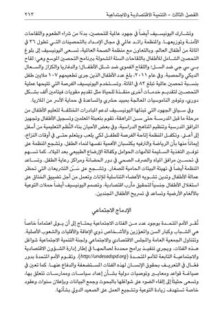 وتش�ارك اليونيس�يف أيضا ً يف جهود عاملية للتحصني ،بدءًا من رشاء الطعوم واللقاحات اآلمن�ة وتوزيعه�ا .واملنظمة رائ�د عاملي يف مجال اإلم�داد بالتحصينات الت�ي تطول 36يف املائة من أطفال العالم .وبالتعاون مع منظمة الصحة العاملية ،تس�عى اليونيسيف إىل بلوغ التحصني الش�امل لألطفال باللقاحات الستة املشمولة بربنامج التحصني املوسع وهي :لقاح ب�ي يس جي ضد الس�ل؛ واللقاح الفموي ضد ش�لل األطف�ال؛ والدفرتيا والكزاز والس�عال الديكي والحصبة .ويف عام ،2011بلغ عدد األطفال الذين جرى تطعيمهم 107ماليني طفل بنس�بة تحصني عاملية تبلغ 83يف املائة .وتس�تخدم اليونيسيف الفرصة التي تتيحها عملية التحصين لتقدي�م خدمـات أخرى منق�ذة للحياة مثل تقديم مقويات فيتامني ألف بش�كل دوري ،وتوفري الناموسيات املعالجة بمبيد حرشي واملساعدة يف حماية األرس من املالريا. ويف س�ياق الجهود التي تبذلها اليونيس�يف لدعم املبادرات املختلف�ة لتعليم األطفال من مرحلة ما قبل املدرس�ة حتى س�ن املراهقة ،تقوم بتعبئة املعلمني وتسجيل األطفال وتجهيز املرافق املدرسية وتنظيم املناهج الدراسية ،ويف بعض األحيان بناء ال ُنظم التعليمية من أسفل إىل أعلى .وتكف�ل املنظمة إتاحة الفرصة للطف�ل لكي يلعب ويتعلم حت�ى يف أوقات النزاع، إيمانا ً منها بأن الرياضة والرتفيه يكتسبان األهمية نفسها لنماء الطفل .وتشجع املنظمة عىل توفير التغذية الس�ليمة لألمهات الحوامل وكفالة اإلرضاع الطبيعي بعد امليالد .كما تس�هم يف تحسين مرافق املياه والرصف الصحي يف دور الحضانة ومراكز رعاية الطفل .وتس�اعد املنظمة أيضا ً يف تهيئة البيئات الحامية للصغار .وتش�جع عىل َس ْ�ن الترشيعات التي تحظر عمالة األطفال وتدين تش�ويه األعضاء التناسلية لإلناث وتعمل من أجل تضييق الخناق عىل استغالل األطفال جنسيا ً لتحقيق مآرب اقتصادية .وتصمم اليونيسيف أيضا ً حمالت التوعية باأللغام األرضية وتساعد يف ترسيح األطفال املجندين.