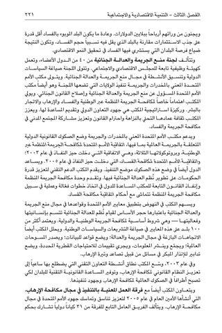 ويجنون من ورائهم أرباحا ً بباليني الدوالرات .وعادة ما يكون البلد املوبوء بالفساد أقل قدرة عىل جذب االس�تثمارات مقارنة بالبلد الذي يقل فيه نس�بيا ً حجم الفس�اد ،وتكون النتيجة ضياع فرصة البلدان التي يسترشي فيها الفساد يف تحقيق النمو االقتصادي. وتتأل�ف لجنة من�ع الجريمة والعدال�ة الجنائية من 40من ال�دول األعضاء ،وتعمل كهيئ�ة وظيفية تابعة للمجل�س االقتصادي واالجتماعي .وتتوىل اللجنة صياغة السياس�ات الدولية وتنس�يق األنش�طة يف مج�ال منع الجريم�ة والعدالة الجنائية .ويت�وىل مكتب األمم املتح�دة املعني باملخدرات والجريم�ة تنفيذ الواليات التي تضعها اللجن�ة وهو أيضا ً مكتب األمم املتحدة املس�ؤول عن منع الجريمة والعدالة الجنائية وإصالح القانون الجنائي .ويويل املكت�ب اهتماما ً خاصا ً ملكافح�ة الجريمة املنظمة عرب الوطنية والفس�اد واإلرهاب واالتجار بالبرش .وركيزة استراتيجية املكتب هي جهود التعاون الدويل وتقديم املساعدة لها .ويعزز املكت�ب ثقافة عماده�ا التحيل بالنزاهة واحرتام القانون وتعزيز مش�اركة املجتمع املدني يف مكافحة الجريمة والفساد. ويدعم مكت�ب األمم املتحدة املعني باملخدرات والجريمة وضع الصكوك القانونية الدولية املتعلق�ة بالجريم�ة العاملية بم�ا فيها ،اتفاقية األم�م املتحدة ملكافح�ة الجريمة املنظمة عرب الوطني�ة ،وبروتوكوالته�ا الثالثة ،وه�ي االتفاقية الت�ي دخلت حيز النف�اذ يف عام 2003؛ واتفاقي�ة األم�م املتحدة ملكافحة الفس�اد ،التي دخل�ت حيز النفاذ يف عام .2005ويس�اعد الدول أيضا ً يف وضع هذه الصكوك موضع التنفيذ .ويقدم املكتب الدعم التقني لتعزيز قدرة الحكوم�ات عىل تطوير ُنظم العدالة الجنائية فيها .وتق�دم وحدة مكافحة الجريمة املنظمة وإنف�اذ القان�ون التابعة للمكتب املس�اعدة للدول يف اتخاذ خطوات ف ّعالة وعملية يف س�بيل مكافحة الجريمة املنظمة تتماىش مع أحكام اتفاقية مكافحة الفساد. ويس�هم املكتب يف النهوض بتطبيق معايري األمم املتحدة وقواعدها يف مجال منع الجريمة والعدالة الجنائية باعتبارها حجر األس�اس لقيام ُنظم للعدالة الجنائية تتس�م بإنس�انيتها وفعاليته�ا — وهي رشوط أساس�ية ملكافحة الجريمة الوطني�ة والدولية .ويعتمد أكثر من 100بل�د عىل هذه املعايري يف صياغة الترشيعات والسياس�ات الوطنية .ويحلل املكتب أيضا ً االتجاه�ات البازغة يف مجال الجريمة والعدالة؛ ويضع قواعد للبيانات؛ ويصدر املس�وحات العاملية؛ ويج ّمع وينشر املعلومات ،ويجري تقييمات لالحتياجات القطرية املحددة ،ويضع تدابري لإلنذار املبكر يف مسائل من قبيل تصاعد وترية اإلرهاب. وس�ع املكتب نطاق أنش�طة التعاون التقني التي يضطلع بها ساعيا ً إىل ويف عام ّ ،2003 تعزي�ز النظام القانوني ملكافحة اإلرهاب ،وتوفري املس�اعدة القانوني�ة التقنية للبلدان لكي تصبح أطرافا ً يف الصكوك العاملية ملكافحة اإلرهاب وجهود تنفيذها. ويتع�اون املكتب أيضا ً مع فرقة العمل املعني�ة بالتنفيذ يف مجال مكافحة اإلرهاب، التي أنشأها األمني العام يف عام 2005لتعزيز تناسق وتماسك جهود األمم املتحدة يف مجال مكافح�ة اإلرهاب .ويتألف الفري�ق العامل التابع للفرقة من 31كيانا ً دوليا ً تش�ارك بحكم