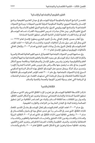 العلوم الطبيعية واالجتماعية واإلنسانية تتضم�ن الربامج الدولية والحكومية الدولية لليونس�كو يف ميدان العل�وم الطبيعية برنامج اإلنس�ان واملحيط الحيوي؛ واللجنة الحكومية الدولية لعل�وم املحيطات؛ وبرنامج التحوالت االجتماعي�ة؛ والربنامج الهيدرولوجي الدويل؛ والربنامج الدويل للعلوم األساس�ية؛ والربنامج الدويل لعلوم األرض .ومن خالل مبادرات تدريس العلوم وبناء القدرات تس�اعد اليونس�كو أيضا ً يف زيادة القدرات العلمية للبلدان النامية ألغراض تحقيق التنمية املستدامة. ويف أعقاب صدور اإلعالن العاملي بش�أن املجني البرشي وحقوق اإلنسان لعام — 1997 الذي يمثل أول نص دويل بش�أن أخالقيات البحوث واملمارس�ات الوراثية — اعتمد املؤتمر العام لليونس�كو اإلعالن الدويل بش�أن بيانات املجني البرشي لع�ام ،2003واإلعالن العاملي ألخالقيات البيولوجيا وحقوق اإلنسان لعام .2005 ويف مساعيها لتيسري التحوالت االجتماعية املفضية إىل تدعيم القيم العاملية للعدالة والحرية والكرامة اإلنسانية ،تركز اليونسكو عىل بحوث الفلسفة والعلوم االجتماعية بما فيها أخالقيات العلم والتكنولوجيا؛ وتعزيز وتدريس حقوق اإلنسان والديمقراطية؛ ومكافحة جميع أشكال التميي�ز بما يف ذلك م�ا يتصل منها باألم�راض مثل فريوس نقص املناع�ة البرشية/اإليدز؛ وتحسني مركز املرأة .ويحتل صميم عمل اليونسكو املتعلق بهذه املسائل الربنامج الحكومي ال�دويل إلدارة التحوالت االجتماعية .ويف عام 2005اعتمد املؤتمر العام لليونس�كو االتفاقية الدولية ملكافحة املنشطات يف مجال الرياضة ،التي تستهدف القضاء عىل استخدام املنشطات يف الرياضة التي تعترب وسيلة لتعزيز التوعية والصحة والتنمية والسالم.