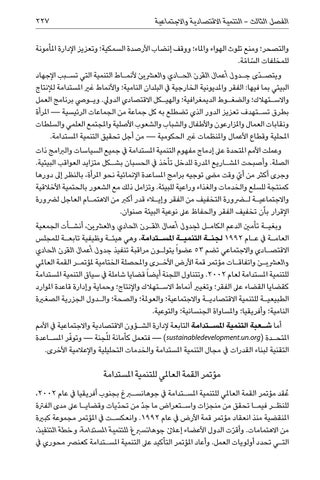 مؤتمر القمة العاملي للتنمية املستدامة عُقد مؤتمر القمة العاملي للتنمية املس�تدامة يف جوهانسبرغ بجنوب أفريقيا يف عام ،2002 للنظ�ر فيم�ا تحقق من منجزات واس�تعراض ما ج ّد من تحدّيات وقضاي�ا عىل مدى الفرتة املنقضية منذ انعقاد مؤتمر قمة األرض يف عام .1992وانعكس�ت يف املؤتمر مجموعة كبرية من االهتمامات .وأق ّرت الدول األعضاء إعالن جوهانسربغ للتنمية املستدامة ،وخطة التنفيذ، الت�ي تحدد أولويات العمل .وأعاد املؤتمر التأكيد عىل التنمية املس�تدامة كعنرص محوري يف