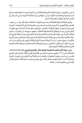الشرب النظيف�ة .وتو ّفر الوكال�ة الدولية للطاقة الذري�ة أيضا ً معدات املعالجة اإلش�عاعية الس�تخدامها يف العالجات الطبية ،وتدرب املوظفني عىل املعالجة املأمونة ملرىض الرسطان يف البلدان النامية والبلدان املتوسطة الدخل. وتتوىل الوكالة الدولية للطاقة الذرية جمع املعلومات املتعلقة عمليا ً بكل جانب من جوانب العل�وم والتكنولوجي�ا النووية وتنرشها عن طري�ق منظومتها الدولي�ة للمعلومات النووية املوج�ودة يف فيين�ا .وتقوم الوكال�ة بالتعاون مع اليونس�كو بإدارة املركز ال�دويل للفيزياء النظرية يف تريس�تا بإيطاليا ( ،)www.ictp.trieste.itوتتعهد مجموعة من املختربات .وتعمل الوكال�ة أيضا ً مع منظمة األمم املتحدة لألغذية والزراعة (الفاو) يف بحوث الطاقة النووية يف مجال األغذية والزراعة ،ومع منظمة الصحة العاملية يف البحوث اإلش�عاعية يف مجال األدوية واألحي�اء .ويقوم مخترب دراس�ة البيئة البحرية التابع للوكالة املوجود يف موناكو بدراس�ات بحري�ة عاملي�ة عن التلوث بالتعاون م�ع برنامج األمم املتحدة للبيئ�ة ومنظمة األمم املتحدة للرتبية والعلم والثقافة (اليونسكو). وتقوم لجنة األمم املتحدة العلمية املعنية بآثار اإلشعاع النووي (،)www.unscear.org املنشأة يف عام ،1955بتقييم مستويات التعرض لإلشعاع املؤ َّين واآلثار املرتتبة عليه وتقديم تقاري�ر عن ذل�ك .وتعتمد الحكومات واملنظم�ات يف كافة أنحاء العالم على تقديرات اللجنة وتتخذها أساس�ا ً علميا ً لتقييم مخاطر اإلش�عاع ،ووضع معايري الحماية اإلش�عاعية واألمان اإلشعاعي وتنظيم املصادر املش ّعة.