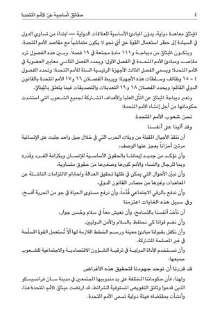 امليثاق معاهدة دولية ،يد ّون املبادئ األساسية للعالقات الدولية — ابتدا ًء من تساوي الدول أي نحو ال يكون متماشيا ً مع مقاصد األمم املتحدة. يف السيادة إىل حظر استعمال القوة عىل ّ ويتك�ون امليثاق من ديباج�ة و 111مادة مج ّمعة يف 19فصالً .وبين هذه الفصول ترد مقاص�د ومبادئ األمم املتح�دة يف الفصل األول؛ ويحدد الفصل الثان�ي معايري العضوية يف األمم املتحدة؛ ويسمي الفصل الثالث األجهزة الرئيسية الستة لألمم املتحدة؛ وتحدد الفصول 15 - 4وظائف وس�لطات هذه األجهزة؛ ويربط الفصلان 16و 17األمم املتحدة بالقانون الدويل القائم؛ ويحدد الفصالن 18و 19التعديالت والتصديقات فيما يتعلق بامليثاق. وتعرب ديباجة امليثاق عن ُ املثل العليا واألهداف املشتركة لجميع الش�عوب التي احتشدت حكوماتها من أجل إنشاء األمم املتحدة: نحن شعوب األمم املتحدة وقد آلينا عىل أنفسنا أن ننقذ األجيال املقبلة من ويالت الحرب التي يف خالل جيل واحد جلبت عىل اإلنسانية مرتني أحزانا ً يعجز عنها الوصف، وأن نؤك�د من جدي�د إيمانن�ا بالحقوق األساس�ية لإلنس�ان وبكرامة الف�رد و َقدَره وبما للرجال والنساء واألمم كبريها وصغريها من حقوق متساوية، وأن نبينّ األحوال التي يمكن يف ظلها تحقيق العدالة واحرتام االلتزامات الناش�ئة عن املعاهدات وغريها من مصادر القانون الدويل، وأن ندفع بالرقي االجتماعي ُقدُماً ،وأن نرفع مستوى الحياة يف جو من الحرية أفسح، ويف سبيل هذه الغايات اعتزمنا وحسن جوار، أن نأخذ أنفسنا بالتسامح ،وأن نعيش معا ً يف سالم ُ وأن نضم قوانا كي نحتفظ بالسالم واألمن الدوليني، وأن نكفل بقبولنا مبادئ معينة ورس�م الخطط الالزمة لها أال ّ ُتستعمل القوة املسلّحة يف غري املصلحة املشرتكة، وأن نس�تخدم األداة الدولي�ة يف ترقي�ة الش�ؤون االقتصادي�ة واالجتماعية للش�عوب جميعها، قد قررنا أن نوحد جهودنا لتحقيق هذه األغراض ولهذا ،فأن حكوماتنا املختلفة عىل يد مندوبيها املجتمعني يف مدينة س�ان فرانسيسكو الذين قدموا وثائق التفويض املستوفية للرشائط ،قد ارتضت ميثاق األمم املتحدة هذا، وأنشأت بمقتضاه هيئة دولية تسمى األمم املتحدة.