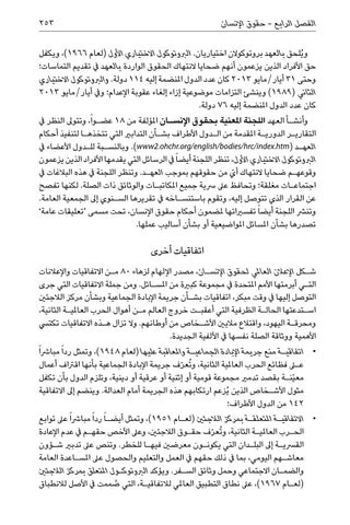 اتفاقيات أخرى ش�كل اإلعالن العاملي لحقوق اإلنس�ان ،مصدر اإللهام لزهاء 80م�ن االتفاقيات واإلعالنات الت�ي أبرمتها األمم املتحدة يف مجموعة كبرية من املس�ائل .ومن جملة االتفاقيات التي جرى التوصل إليها يف وقت مبكر ،اتفاقيات بش�أن جريمة اإلبادة الجماعية وبشأن مركز الالجئني اس�تدعتها الحال�ة الظرفية التي أعقب�ت خروج العالم م�ن أهوال الحرب العاملي�ة الثانية، ومحرق�ة اليهود ،واقتالع ماليني األش�خاص من أوطانهم .وال تزال ه�ذه االتفاقيات تكتيس األهمية ووثاقة الصلة نفسها يف األلفية الجديدة. • •اتفاقي�ة منع جريمة اإلبادة الجماعي�ة واملعاقبة عليها (لعام ،)1948وتمثل ردا ً مبارشا ً على فظائع الحرب العاملية الثانية ،و ُتع ّرف جريمة اإلبادة الجماعية بأنها اقرتاف أعمال معيّن�ة بقصد تدمري مجموعة قومية أو إثنية أو عرقية أو دينية ،وتلزم الدول بأن تكفل مثول األش�خاص الذين ُيزعم ارتكابهم هذه الجريمة أمام العدالة .وينضم إىل االتفاقية 142من الدول األطراف؛ • •االتفاقي�ة املتعلق�ة بمركز الالجئني (لع�ام ،)1951وتمثل أيض�ا ً ردا ً مبارشا ً عىل توابع الح�رب العاملي�ة الثانية ،و ُتع ّرف حق�وق الالجئني ،وعىل األخص حقه�م يف عدم اإلعادة القرسي�ة إىل البل�دان التي يكون�ون معرضني فيه�ا للخطر .وتنص عىل تدبري ش�ؤون معاش�هم اليومي ،بما يف ذلك حقهم يف العمل والتعليم والحصول عىل املس�اعدة العامة والضم�ان االجتماعي وحمل وثائق الس�فر .ويؤكد الربوتوك�ول املتعلق بمركز الالجئني صممت يف األصل لالنطباق (لع�ام ،)1967عىل نطاق التطبيق العاملي لالتفاقي�ة ،التي ُ