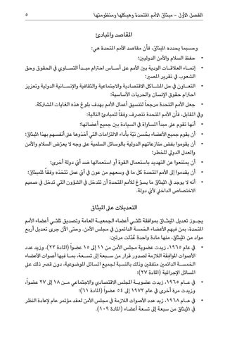 التعديالت عىل امليثاق يج�وز تعديل امليث�اق بموافقة ثلث�ي أعضاء الجمعي�ة العامة وتصديق ثلث�ي أعضاء األمم املتحدة ،بمن فيهم األعضاء الخمسة الدائمون يف مجلس األمن .وحتى اآلن جرى تعديل أربع مواد من امليثاق ،منها مادة واحدة ُعدّلت مرتني: • •يف عام ،1965زيدت عضوية مجلس األمن من 11إىل 15عضوا ً (املادة ،)23وزيد عدد األصوات املوافِقة الالزمة لصدور قرار من س�بعة إىل تس�عة ،بم�ا فيها أصوات األعضاء الخمس�ة الدائمني متفقني وذلك بالنسبة لجميع املسائل املوضوعية ،دون قرص ذلك عىل املسائل اإلجرائية (املادة )27؛ • •يف ع�ام ،1965زيدت عضوي�ة املجلس االقتصادي واالجتماعي م�ن 18إىل 27عضواً، وزيدت مرة أخرى يف عام 1973إىل 54عضوا ً (املادة )61؛ • •يف ع�ام ،1968زيد عدد األصوات الالزمة يف مجلس األمن لعقد مؤتمر عام إلعادة النظر يف امليثاق من سبعة إىل تسعة أعضاء (املادة .)109