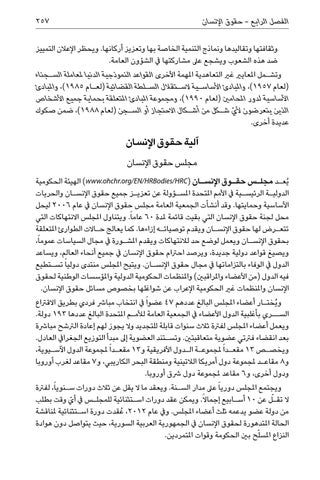 آلية حقوق اإلنسان مجلس حقوق اإلنسان ُيع�د مجل�س حق�وق اإلنس�ان ( )www.ohchr.org/EN/HRBodies/HRCالهيئة الحكومية الدولي�ة الرئيس�ية يف األمم املتحدة املس�ؤولة عن تعزي�ز جميع حقوق اإلنس�ان والحريات األساسية وحمايتها .وقد أنشأت الجمعية العامة مجلس حقوق اإلنسان يف عام 2006ليحل محل لجنة حقوق اإلنسان التي بقيت قائمة ملدة 60عاماً .ويتناول املجلس االنتهاكات التي تتع�رض لها حقوق اإلنس�ان ويقدم توصيات�ه إزاءها .كما يعالج ح�االت الطوارئ املتعلقة بحقوق اإلنس�ان ويعمل لوضع حد لالنتهاكات ويقدم املش�ورة يف مجال السياسات عموماً، ويصيغ قواعد دولية جديدة ،ويرصد احرتام حقوق اإلنسان يف جميع أنحاء العالم ،ويساعد الدول يف الوفاء بالتزاماتها يف مجال حقوق اإلنس�ان .ويتيح املجلس منتدى دوليا ً تس�تطيع فيه الدول (من األعضاء واملراقبني) واملنظمات الحكومية الدولية واملؤسسات الوطنية لحقوق اإلنسان واملنظمات غري الحكومية اإلعراب عن شواغلها بخصوص مسائل حقوق اإلنسان. و ُيخت�ار أعضاء املجلس البالغ عددهم 47عضوا ً يف انتخاب مبارش فردي بطريق االقرتاع الس�ـري بأغلبية الدول األعضاء يف الجمعية العامة لألم�م املتحدة البالغ عددها 193دولة. ويعمل أعضاء املجلس لفرتة ثالث سنوات قابلة للتجديد وال يجوز لهم إعادة الرتشح مبارشة بعد انقضاء فرتتي عضوية متعاقبتني .وتس�تند العضوية إىل مبدأ التوزيع الجغرايف العادل. ويخص�ص 13مقع�دا ً ملجموع�ة ال�دول األفريقية و 13مقع�دا ً ملجموعة الدول اآلس�يوية، و 8مقاع�د ملجموعة دول أمريكا الالتينية ومنطقة البحر الكاريبي ،و 7مقاعد لغرب أوروبا ودول أخرى ،و 6مقاعد ملجموعة دول رشق أوروبا. ويجتمع املجلس دوريا ً عىل مدار الس�نة .ويعقد ما ال يقل عن ثالث دورات س�نوياً ،لفرتة ال ّ أي وقت بطلب تق�ل عن 10أس�ابيع إجماالً .ويمكن عقد دورات اس�تثنائية للمجل�س يف ّ من دولة عضو يدعمه ثلث أعضاء املجلس .ويف عام ،2012عُقدت دورة اس�تثنائية ملناقشة الحالة املتدهورة لحقوق اإلنسان يف الجمهورية العربية السورية ،حيث يتواصل دون هوادة النزاع املسلّح بني الحكومة وقوات املتمردين.