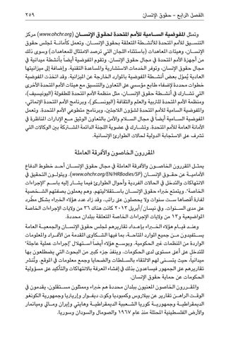 املقررون الخاصون واألفرقة العاملة يمث�ل املقررون الخاص�ون واألفرقة العاملة يف مجال حقوق اإلنس�ان أح�د خطوط الدفاع األمامي�ة عن حق�وق اإلنس�ان ( .)www.ohchr.org/EN/HRBodies/SPويتول�ون التحقيق يف االنتهاكات والتدخل يف الحاالت الفردية وأحوال الطوارئ فيما يش�ار إليه باس�م ‘اإلجراءات الخاصة’ .ويتمتع خرباء حقوق اإلنس�ان باس�تقالليتهم .وهم يعملون بصفتهم الش�خصية لفرتة أقصاها س�ت سنوات وال يحصلون عىل راتب .وقد زاد عدد هؤالء الخرباء بشكل ّ مطرد عىل مدى الس�نوات .ويف نيسان/أبريل 2013كانت هناك 36من واليات اإلجراءات الخاصة املواضيعية و 13من واليات اإلجراءات الخاصة املتعلقة ببلدان محددة. وعن�د قي�ام هؤالء الخبراء بإع�داد تقاريرهم ملجلس حقوق اإلنس�ان والجمعي�ة العامة يس�تفيدون م�ن جميع املوارد املتاح�ة ،بما فيها الش�كاوى املقدمة من األف�راد واملعلومات الواردة من املنظمات غري الحكومية .وبوس�ع هؤالء أيضا ً اس�تهالل ‘إجراءات عملية عاجلة’ للتدخل عىل أعىل مستوى لدى الحكومات .وينفذ جزء كبري من البحوث التي يضطلعون بها ميدانياً ،حيث يتس�نى لهم االلتقاء بالس�لطات والضحايا وجمع معلومات يف املوقع .و ُتنرش تقاريرهم عىل الجمهور فيساعدون بذلك يف إفشاء املعرفة باالنتهاكات والتأكيد عىل مسؤولية الحكومات عن حماية حقوق اإلنسان. واملق�ررون الخاصون املعنيون ببلدان محددة هم خرباء وممثلون مس�تقلون ،يقدمون يف الوق�ت الراه�ن تقارير عن بيالروس وكمبوديا وكوت ديف�وار وإريرتيا وجمهورية الكونغو الديمقراطي�ة وجمهوري�ة كوريا الش�عبية الديمقراطي�ة وهايتي وإيران وم�ايل وميانمار واألرض الفلسطينية املحتلة منذ عام 1967والصومال والسودان وسوريا.