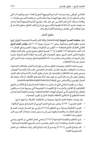 حقوق العمل تمثل منظمة العم�ل الدولية ( )www.ilo.orgوكالة األمم املتحدة املتخصصة املوكول إليها تحديد حقوق العمل وحمايتها .وحتى 15حزيران/يونيه 2013كان مؤتمر العمل الدويل الثالثي األطراف التابع للمنظمة — املكون من الحكومات وجهات العمل وممثيل العمال — ق�د اعتمد ما إجماليه 189اتفاقي�ة و 202توصية تتعلق بجميع نواحي عالم العمل وتؤلف منظومة قانون العمل الدويل .وتوفر التوصيات التي ُتصدرها منظمة العمل الدولية مشورة بشأن السياسات والترشيعات واملمارسات ،أما اتفاقياتها فتخلق واجبات ملزمة للدول التي تصدق عىل هذه االتفاقيات. وجرى اعتماد اتفاقيات وتوصيات تتعلق بمسائل من ِقبَل إدارة العمل ،والعالقات الصناعية، وسياس�ات التوظيف ،وظروف العم�ل ،والضمان االجتماعي ،والسلامة والصح�ة املهنيتان. ويسعى بعض هذه االتفاقيات والتوصيات إىل ضمان حقوق اإلنسان األساسية يف مكان العمل، ثان مس�ائل أخرى من قبيل عمل املرأة وتش�غيل األطفال ،أو فئات معينة مثل ويتناول بعض ٍ العمال املهاجرين واألشخاص ذوي اإلعاقة (.)www.ilo.org/ilolex/english/index.htm ويتأس�س اإلجراء الرقابي الذي تس�تعني ب�ه منظمة العمل الدولي�ة يف التأكد من تطبيق اتفاقياته�ا يف القانون واملمارس�ة ،يف التقييم�ات املوضوعية التي يجريها خرباء مس�تقلون والنظ�ر يف الدعاوى الت�ي ُترفع إىل الهيئات الثالثية للمنظمة .وتعم�ل املنظمة أيضا ً بتدابري خاصة للتحقيق يف الشكاوى املتعلقة بانتهاك الحق يف تكوين الجمعيات. وقد وضعت منظمة العمل الدولية مجموعة من االتفاقيات الفارقة ،بما فيها ما ييل: السخ َرة يف جميع أشكالها؛ • •العمل الجربي ()1930؛ وتنص عىل قمع العمل الجربي أو ُ • •الحري�ة النقابية وحماية ح�ق التنظيم ()1948؛ و ُتريس حق العم�ال وأرباب العمل يف تش�كيل املنظم�ات واالنضمام إليها بدون إذن مس�بق ،وتحدد ضمانات التس�يري الحر لشؤون هذه املنظمات؛ • •ح�ق التنظيم واملفاوضة الجماعية ()1949؛ وتحمي العمل النقابي من التمييز وتحمي منظمات العمال ومنظمات أرباب العمل وتتضمن تدابري لتشجيع املفاوضة الجماعية؛ • •املس�اواة يف األج�ور ()1951؛ وتدع�و إىل املس�اواة يف األجر واالس�تحقاقات عن العمل املتساوي يف القيمة؛