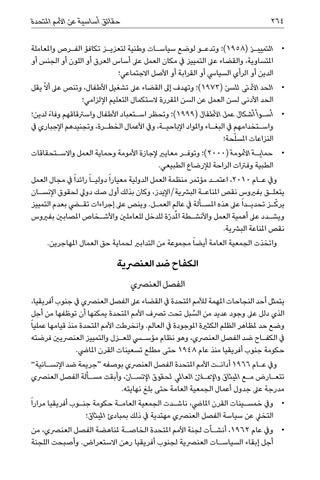 الكفاح ضد العنرصية الفصل العنرصي يتمثل أحد النجاحات املهمة لألمم املتحدة يف القضاء عىل الفصل العنرصي يف جنوب أفريقيا، السبل تحت ترصف األمم املتحدة يمكنها أن توظفها من أجل الذي دلل عىل وجود عديد من ُ وضع حد ملظاهر الظلم الكثرية املوجودة يف العالم .وانخرطت األمم املتحدة منذ قيامها عمليا ً يف الكف�اح ضد الفصل العنرصي ،وهو نظام مؤسسي للع�زل والتمييز العنرصيني فرضته حكومة جنوب أفريقيا منذ عام 1948حتى مطلع تسعينات القرن املايض. ويف ع�ام 1966أدان�ت األمم املتحدة الفصل العنرصي بوصفه “جريمة ضد اإلنس�انية” تتع�ارض م�ع امليثاق واإلعلان العاملي لحقوق اإلنس�ان ،وأبقت مس�ألة الفصل العنرصي مدرجة عىل جدول أعمال الجمعية العامة حتى بلغ نهايته. • •ويف خمس�ينات القرن املايض ،ناش�دت الجمعية العام�ة حكومة جن�وب أفريقيا مرارا ً التخيل عن سياسة الفصل العنرصي مهتدية يف ذلك بمبادئ امليثاق؛ • •ويف عام ،1962أنش�أت لجنة األمم املتحدة الخاص�ة ملناهضة الفصل العنرصي ،من أجل إبقاء السياس�ات العنرصية لجنوب أفريقيا رهن االستعراض .وأصبحت اللجنة